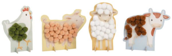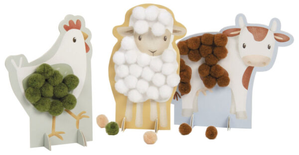 Stick the pompom with the right colour on the sheep, chicken, cow and pig and create the most beautiful paintings! Creative toys for practising fine motor skills and concentration during a crafting afternoon.