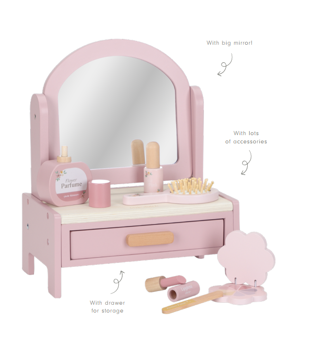 Mirrors, mirrors on the wall. This wooden dressing table from Little Dutch is every girl's dream and is designed for children to encourage them to use their imagination. The dressing table comes with a rotating mirror and a range of beauty products (not real), including a hairbrush, perfume, lipstick, eyeshadow, nail file and nail polish. It also has a storage drawer for hair ties (not included) and clips (not included). The pink-toned dressing table is a nice and stylish addition to any playroom. Perfect for little beauty fans who love to decorate and pamper themselves. Let their imaginations run wild!