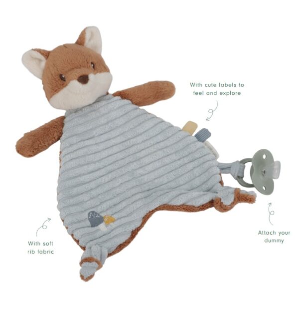 The soft cloth of its body features delightful details including playful labels, a Forest Friends embroidery, and two knots for tiny hands to grasp and hold onto. With the convenient loop, it’s easy to attach a pacifier to keep it close.