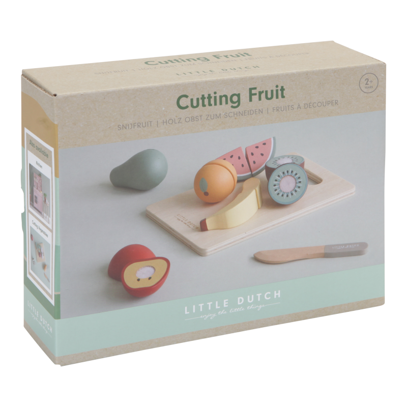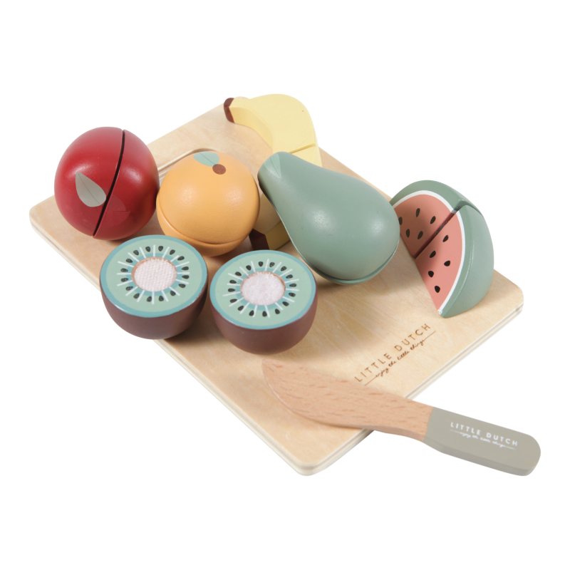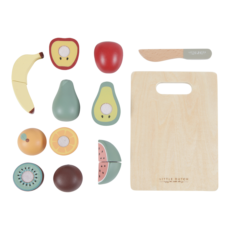 Eat fruit every day! Your child will love copying you in preparing a variety of fruits with this cute wooden set of 6 different fruits. A cutting board and wooden knife are included to divide the fruits in half and reveal the inside. What's your favourite? Apple, banana, kiwi fruit, pear, orange or a slice of water melon? (Have your pick!) All fruits can easily be put back together with velcro.