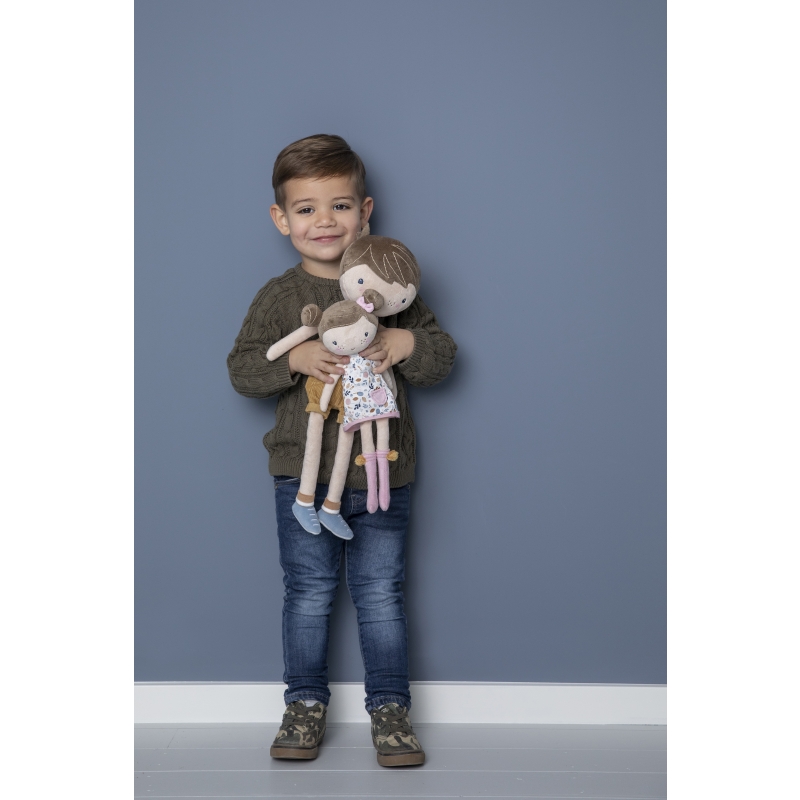 Jim the cute plush cuddle doll in his cool dungarees is soft and lovely to cuddle with. Jim can sit up and likes to go with you in the Little Dutch wooden doll stroller.