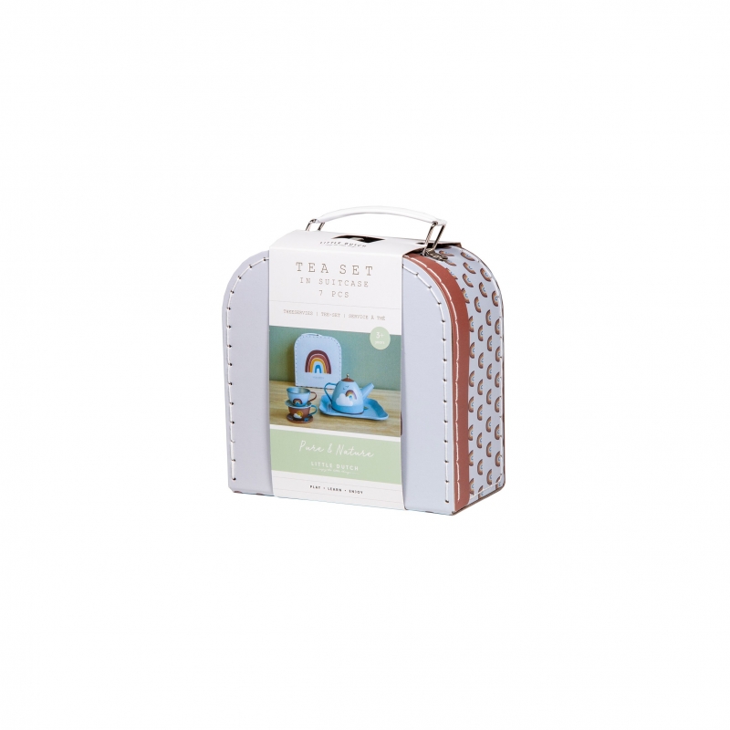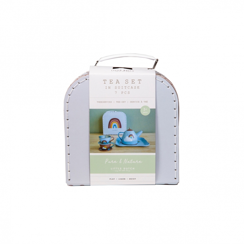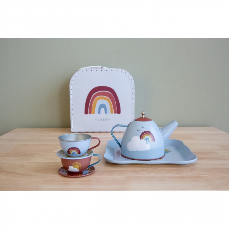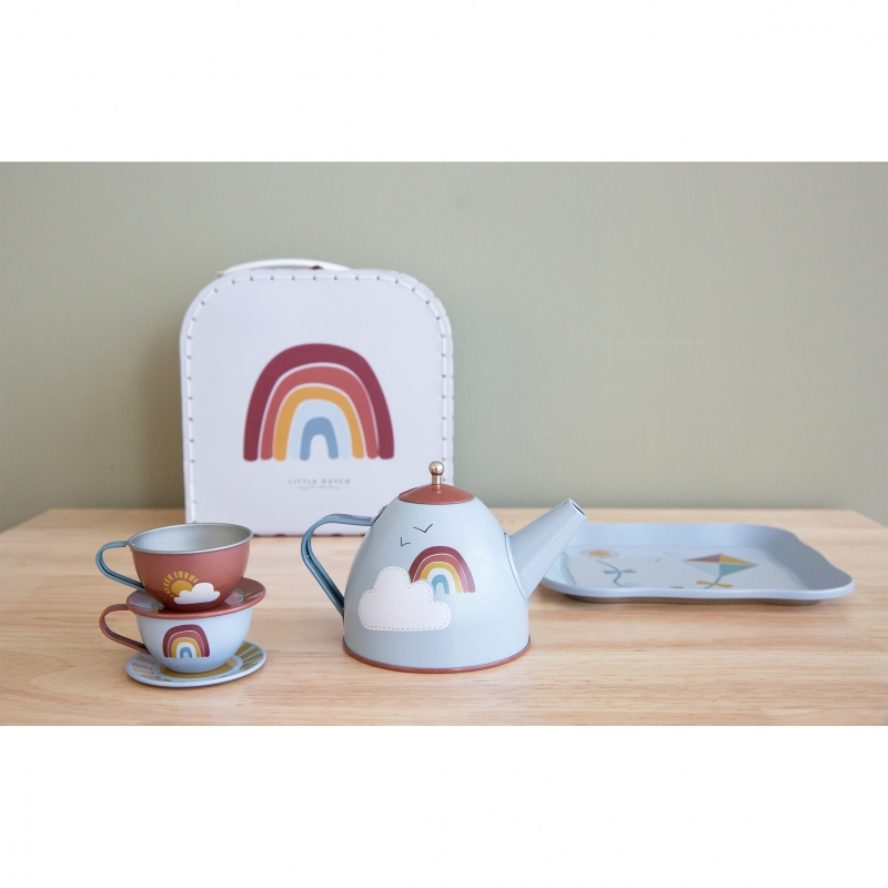 Unpack the lovely picnic basket and have a wonderful pretend-play tea party with this cute Little Dutch tin tea set, illustrated with cute rainbows and natural elements. Role play sparks children's imagination and is great for the development of social skills. Pouring and holding the cups also improves their fine motor skills. The set comes in a beautiful basket and consists of two tea cups, two saucers, a serving tray, and a teapot with lid.