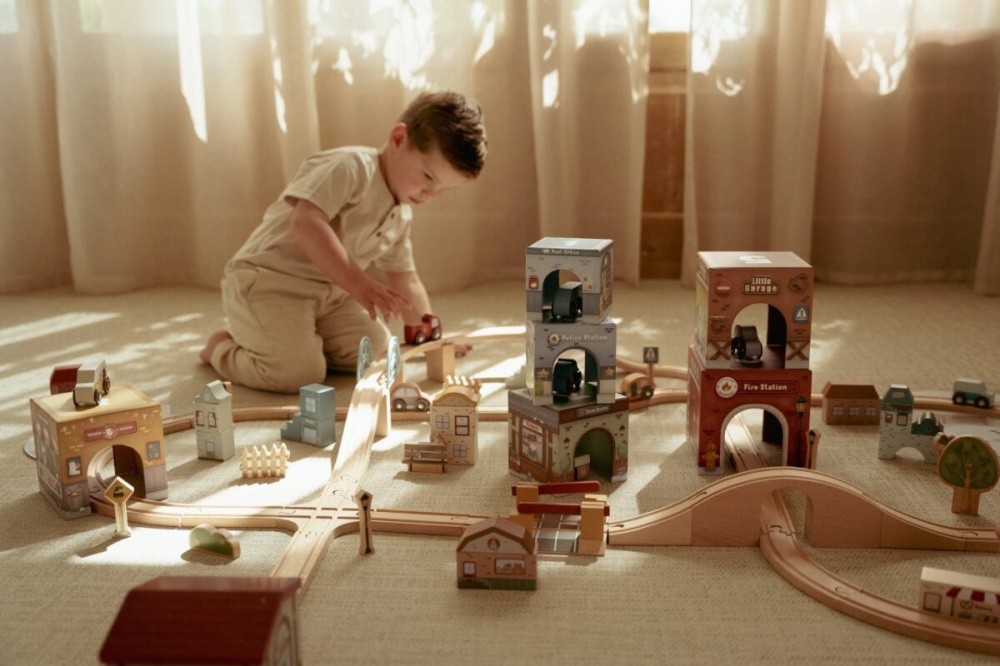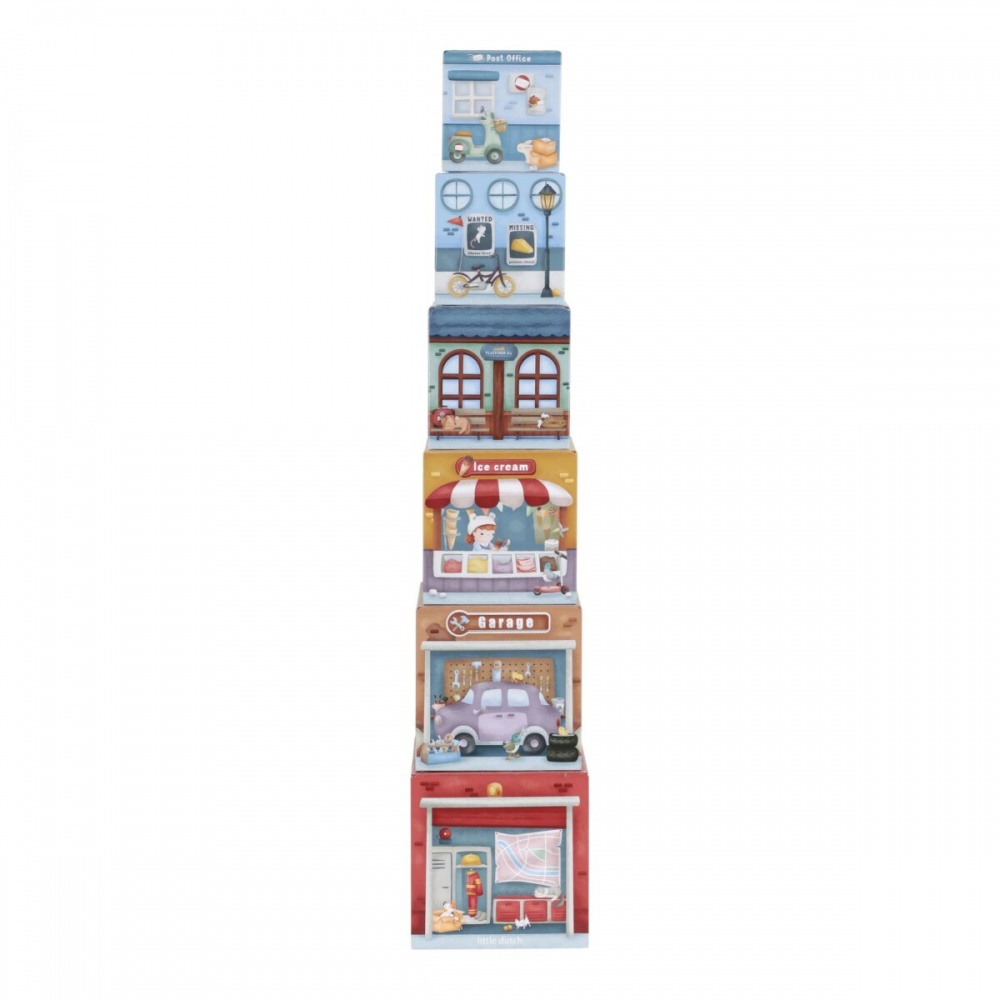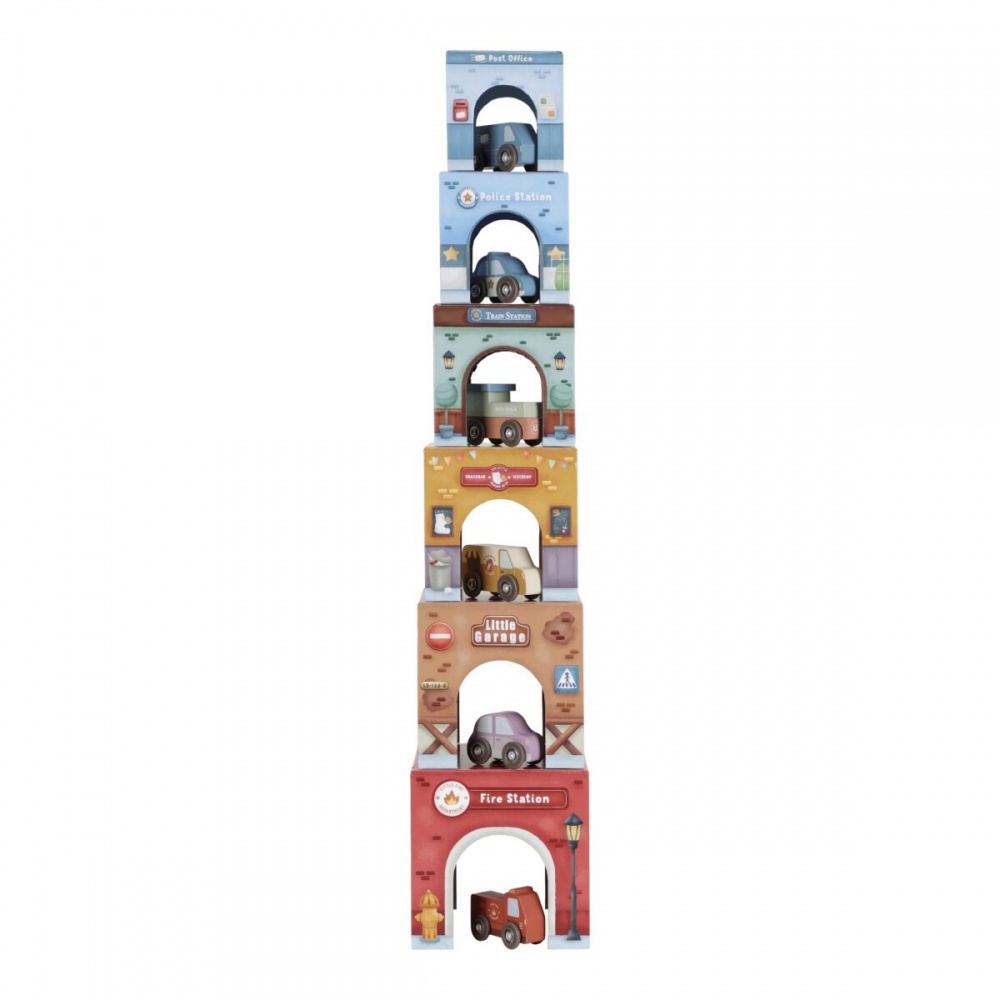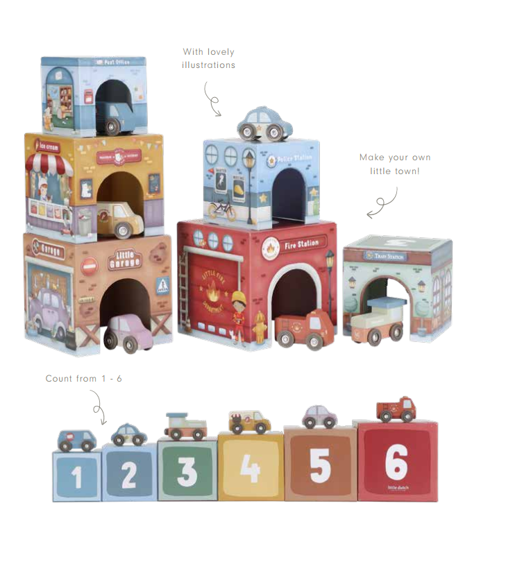 Build a cool pyramid with cars and learn numbers from 1 to 6. This is a great toy for your child to develop logical thinking, finger and eye coordination. To learn about sizes, build a tower of blocks or lay them down horizontally. The toy consists of 6 blocks of different sizes, each side of which is decorated differently. The blocks can be stacked on top of each other or placed on the Little Dutch Train Track XL so that vehicles can easily drive under them. Each block has unique illustrations and its own vehicle. A fun way to develop imagination and motor skills! The blocks are made of strong and durable cardboard, which is also resistant to falling.