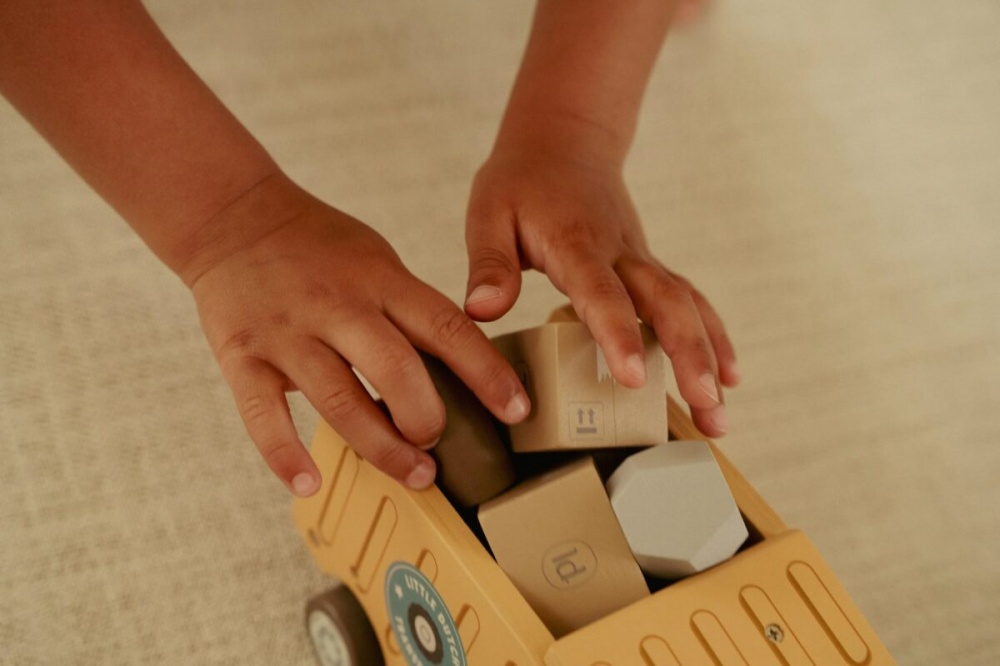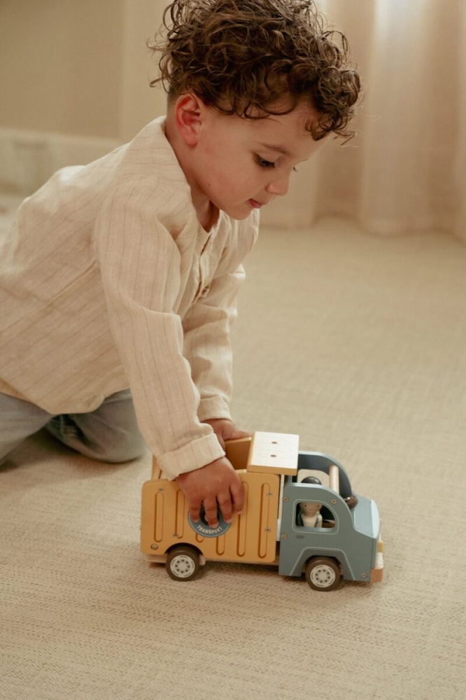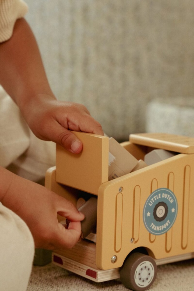 It's time to unload the goods! This Little Dutch wooden dump truck has a tilting box and comes with two drivers. The set includes various loads such as logs, stones and wooden boxes. Drive to the construction site, tilt the box and unload the goods. This wooden truck is perfect for other Little Dutch machines.