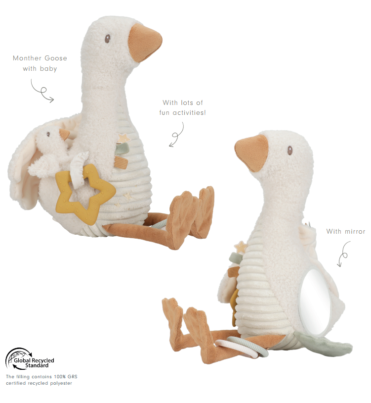 Cuddle and play! This cute goose from Little Dutch will become your child's new best friend. There's so much to see, hear and discover. This activity goose stimulates the senses with different textures, rattles and playful labels. The goose also holds a large mirror in its cuddly toy, which will arouse your little one's curiosity. Perfect for holding, cuddling and developing motor skills. Thanks to its comfortable size, it is ideal for little hands to grab and explore, and is sure to stimulate your child's curiosity. For little adventurers with big curiosity!