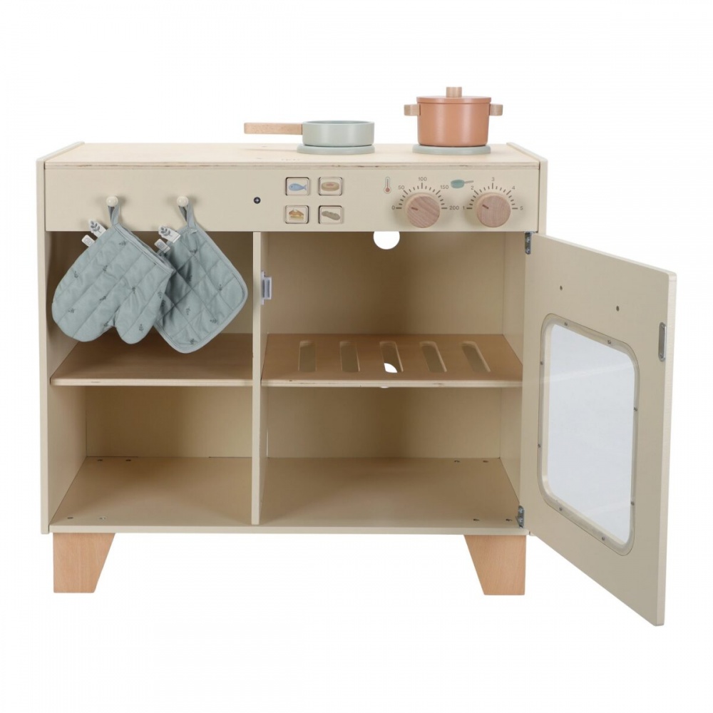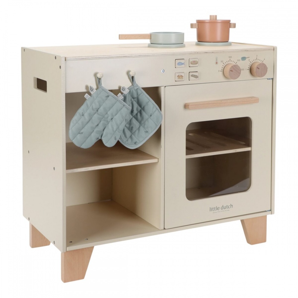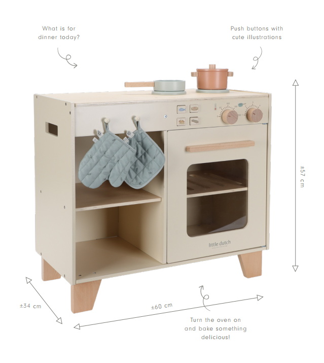 Attention, little chefs! This beautiful wooden play kitchen from Little Dutch is perfect for preparing delicious dishes. Treat your family or your favorite dolls and stuffed animals to a particularly delicious home-cooked meal. Bake a cake in the oven or prepare fresh vegetables on the stove. The set includes a pan, pot, oven mitt and pot stand, and the kitchen is equipped with push-buttons for even more realistic play. Combine the kitchen with a refrigerator or washing machine set to create a complete play kitchen. The kitchen helps with role-playing and develops creativity, motor skills and imagination. What's on the menu today?