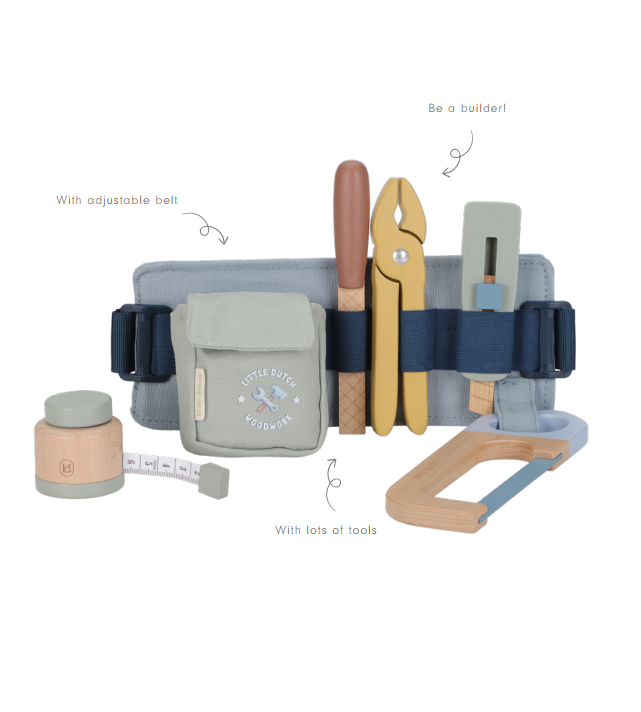 Fasten your tool belt and get building! There are so many things to build and fix in the house. With your own set of measuring tape, pliers, knife, file and handsaw, you have all the tools you need for small construction projects. Little ones love to copy their parents and imitate everything they do. This stylish adjustable play belt from Little Dutch develops creativity and motor skills and allows children to let their imagination run wild. A great set for role-playing with 5 tools. Use with the Little Dutch play bench and toolbox to expand the range of tools and give your child a special workspace.