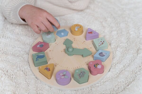 What time is it? This educational wooden puzzle clock teaches your little one the first basics about time. It has moveable hands and contains 12 shaped number pieces that fit into matching slots.