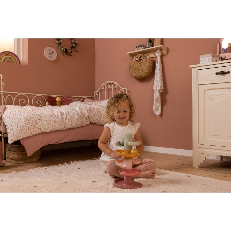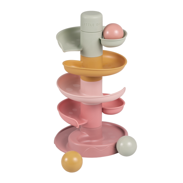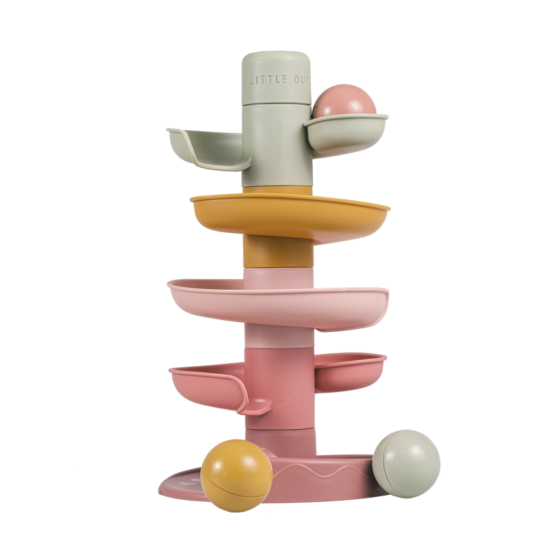 The colourful toy consists of 5 soft-hued pieces that your little one can easily stack. Drop the balls one by one onto the top tier and see how each of them winds and rolls down.