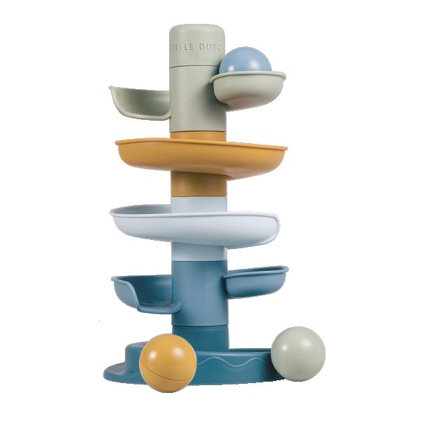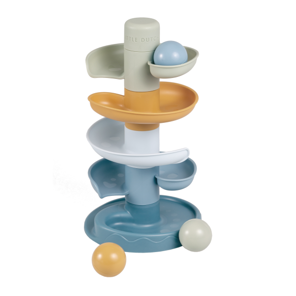 The colourful toy consists of 5 soft-hued pieces that your little one can easily stack. Drop the balls one by one onto the top tier and see how each of them winds and rolls down.
