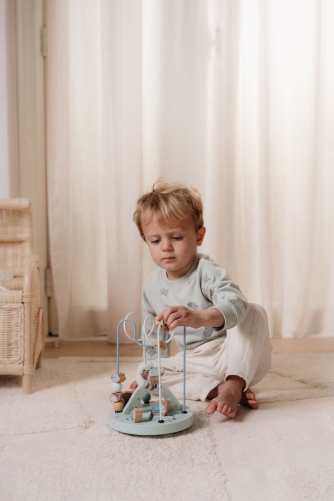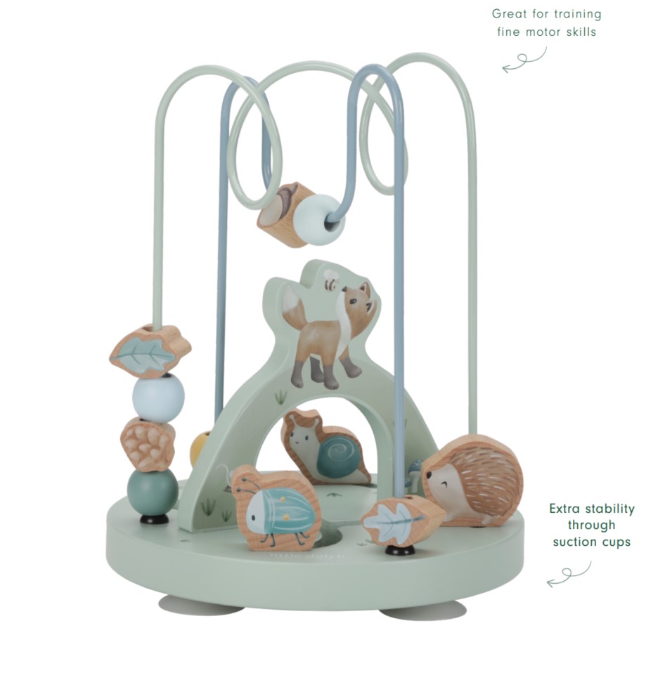 Guide the beads from left to right through the enchanted world of Forest Friends. Along the way you will meet the friendly fox, hedgehog, beetle, and little snail that live and play in the forest. Slide them from side to side to discover the tasty acorns, lush leaves, and pine cones nestled between the roots of the trees. Let the journey begin and watch imagination soar! This wooden activity spiral provides an educational and enchanting experience for your little one.