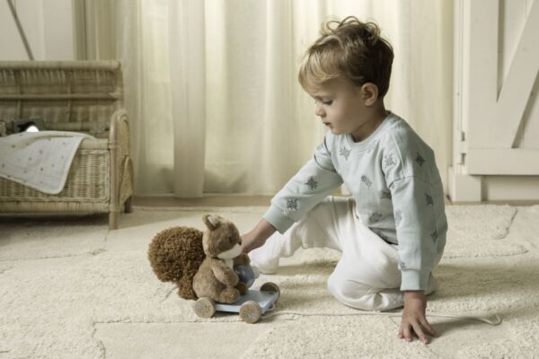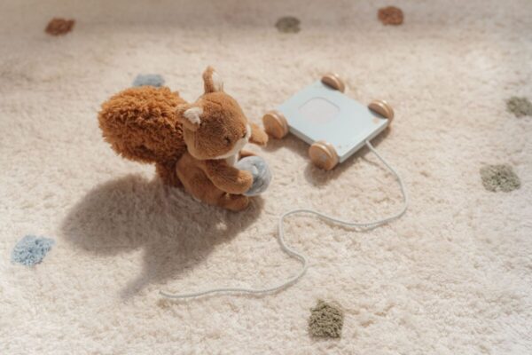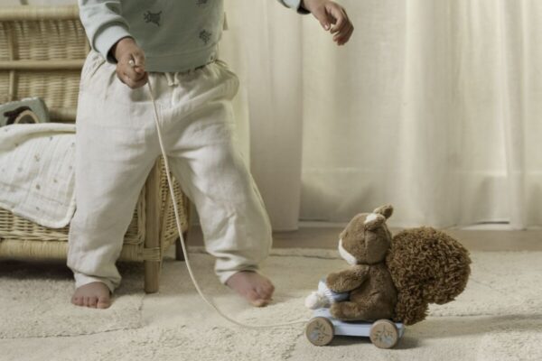The squirrel will follow you through the enchanted forest of Forest Friends, where friendly animals play with leaves, acorns, pinecones, and mushrooms amongst the tallest trees. The soft and cuddly squirrel of this pull-along toy stands on a blue wooden carriage decorated with leaves. With the little string, your little one can guide him through the house and play.