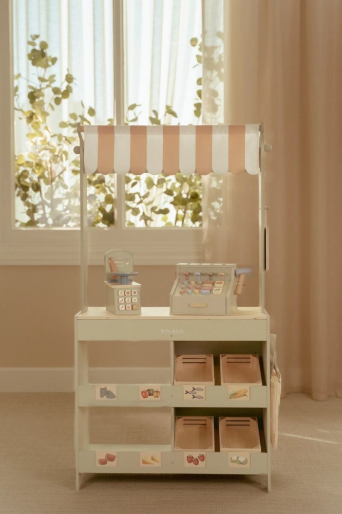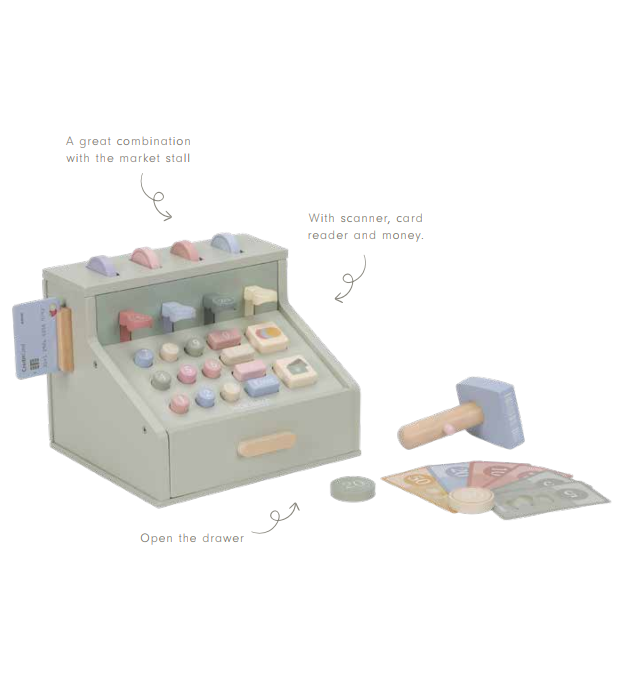 This well-designed and beautifully designed wooden cash register is perfect for hours of enjoyable role play. Count, scan and pay! This wooden cash register from Little Dutch makes playing in a shop feel even more authentic. The cash register has a scanner, card reader, buttons and a drawer for coins and paper money. It also comes with a bank card so customers can pay with cash or card. A great way to learn about money and numbers in a playful way. What are you buying today?