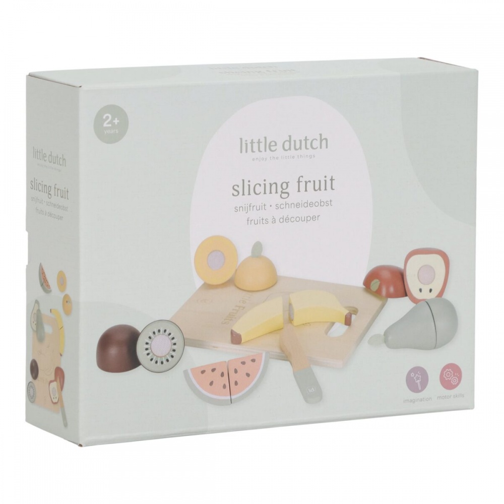 Treat yourself to fruit every day! This wooden fruit set from Little Dutch is a playful way to stimulate your child's role-play. Your child will enjoy imitating your actions. A cutting board and a wooden toy knife are included for cutting the fruit in half. Each fruit can be cut in half with a wooden knife and easily put back together again using the snap fastener. What's your favorite? Apple, banana, kiwi, pear, orange or a slice of watermelon? Let them choose! Perfect for little chefs who love to play and practice cutting!