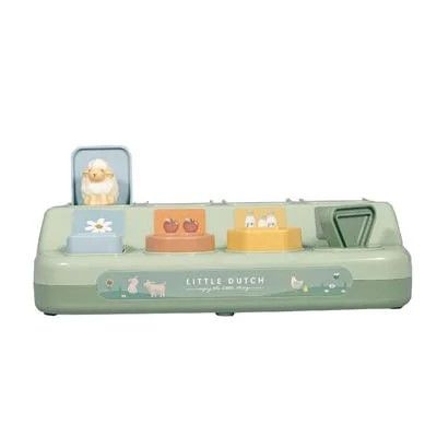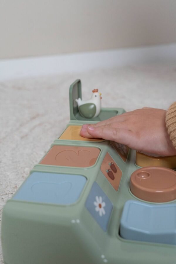 Peekaboo! Which farm animal appears when you press the buttons? Is it a sheep, pig, cow or chicken? The fun thing about the Pop-Up animals is that you can turn them into a fun game together with your child. Which animal likes to walk among the flowers in the meadow? Which farm animal loves apples? Which animal does your milk come from? Which animal lays an egg? This simple game gives your child a lot of fun. While discovering the different farm animals, your child will develop his/her problem-solving and fine motor skills through play.