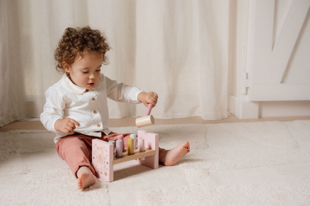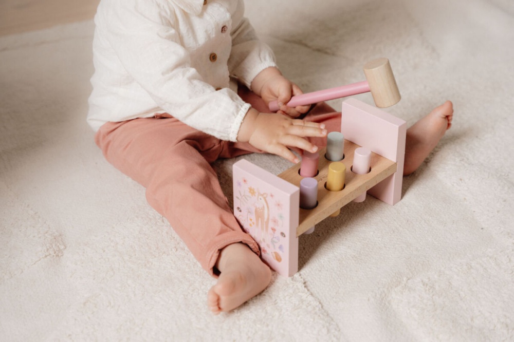 Tap tap tap! The cool Little Dutch wooden pounding bench is fun for boys and girls. Your child can hammer the pegs one by one deeper into this fun pounding bench. The 6 coloured pegs make it a very good exercise for your child’s motor skills. Did they hammer in all the pegs? Turn the bench over so they can start over again. They will be entertained for hours! Available in two colours: blue and pink.