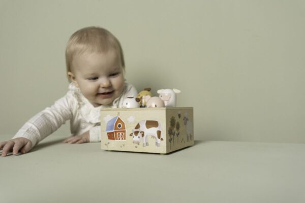 The sturdy wooden box of this interactive pop-up toy is adorned with friendly illustrations of Little Farm, designed to captivate the imagination of your little one.