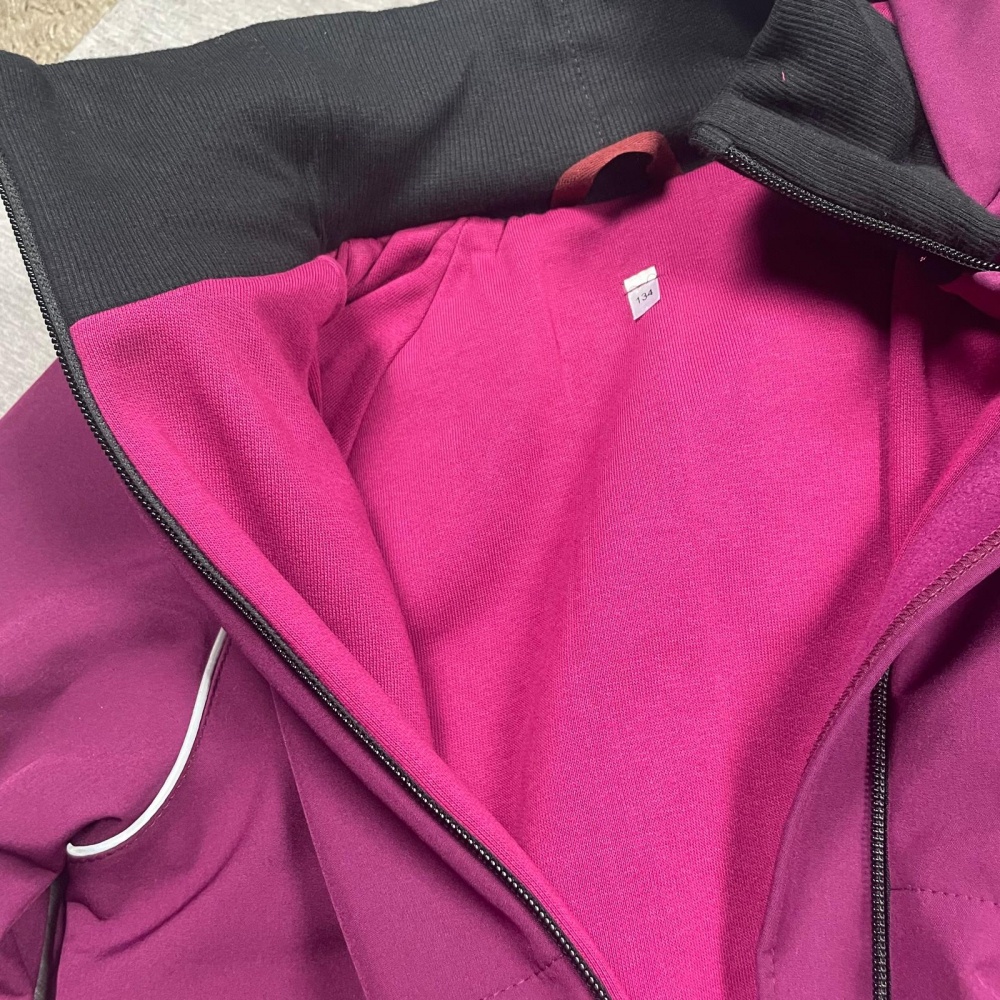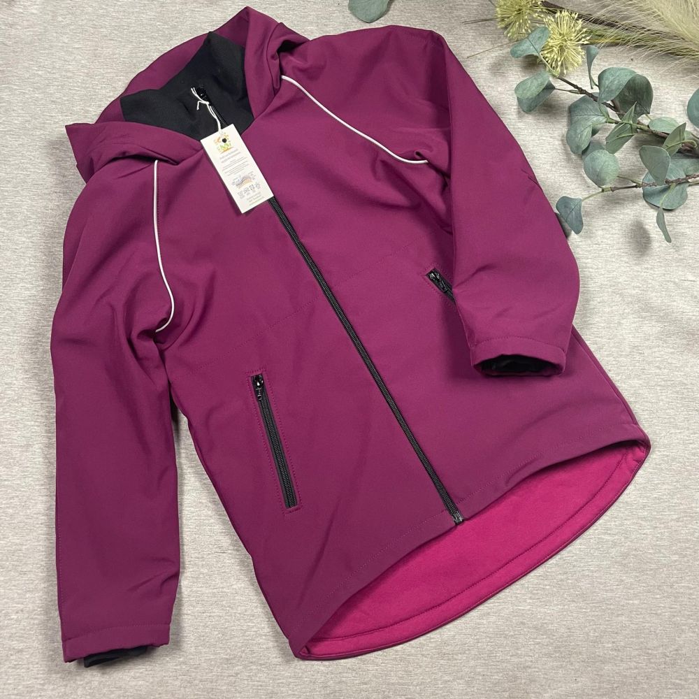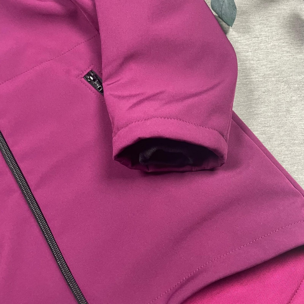 Comfortable and soft softshell fabric children's windbreaker with cotton fleece insulation and hood.