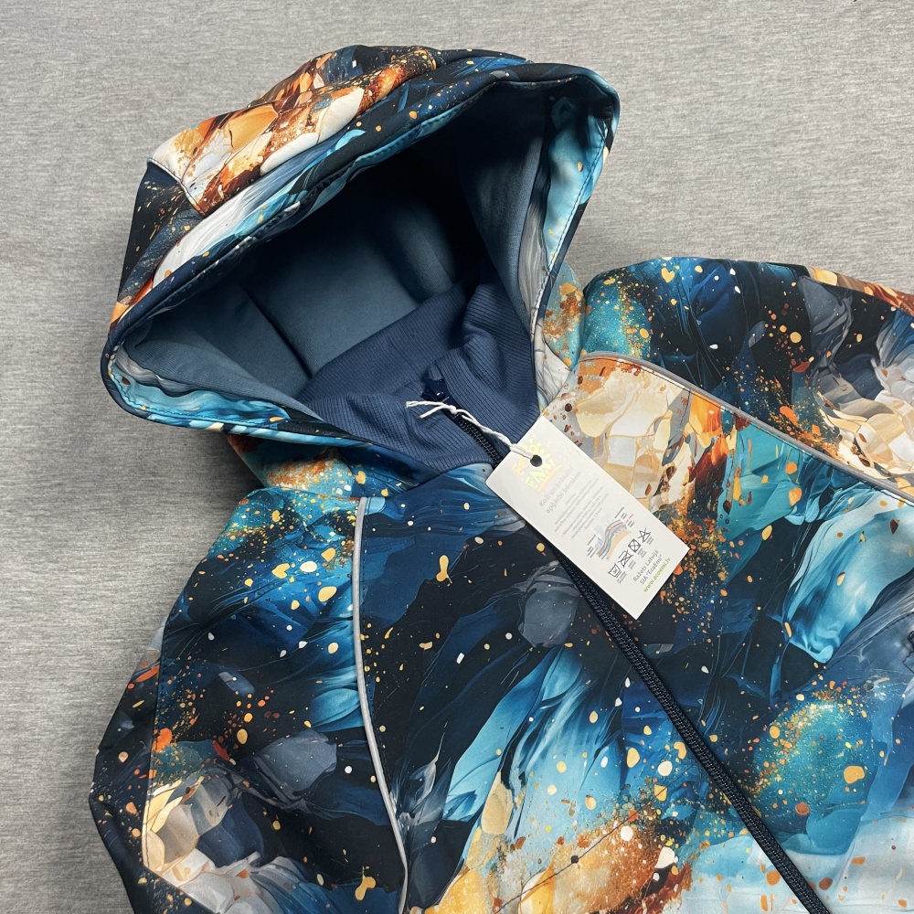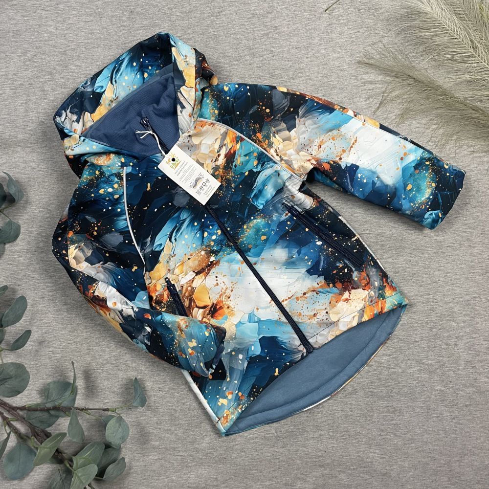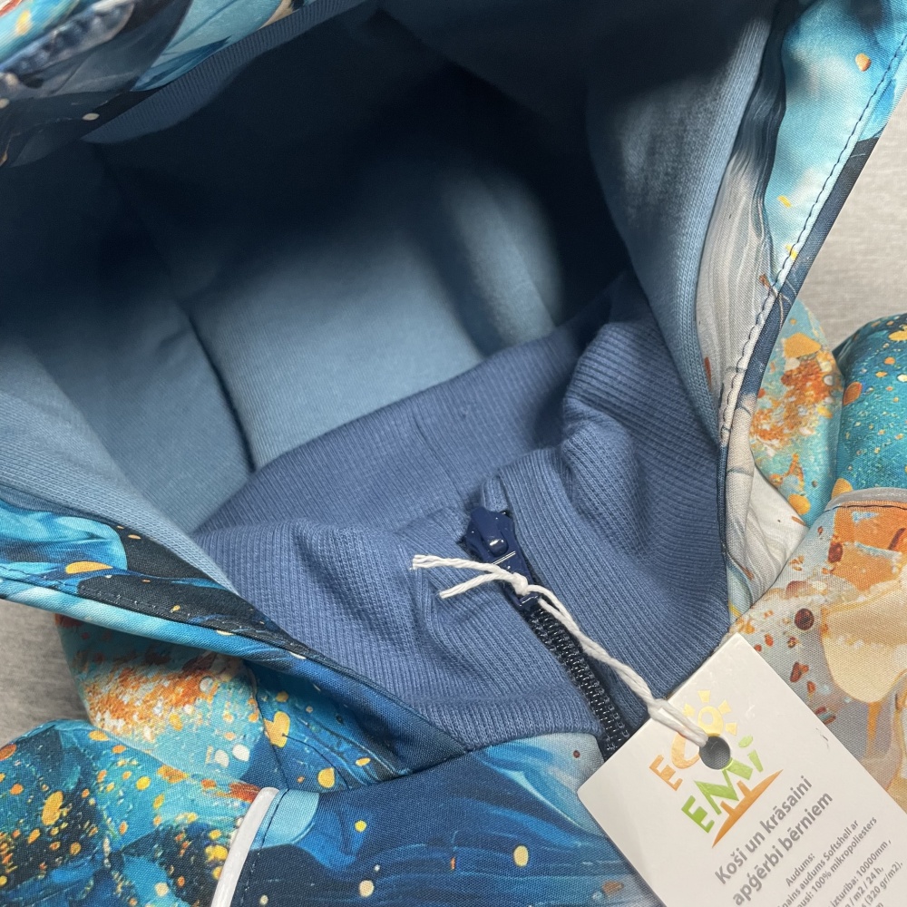 Comfortable and soft softshell fabric children's windbreaker with cotton fleece insulation and hood.