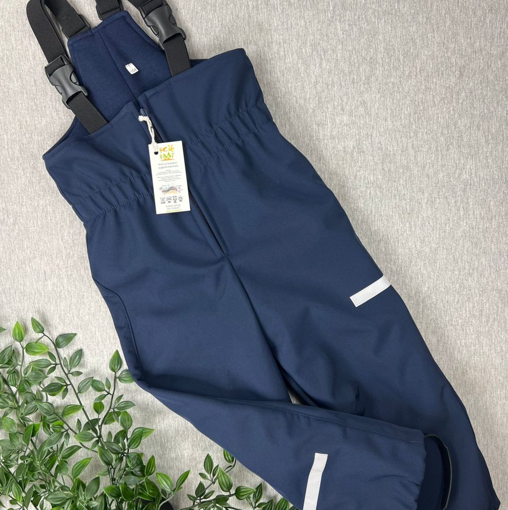 Pants have raised waist, so the kids back will always be warm. Adjustable strap length.