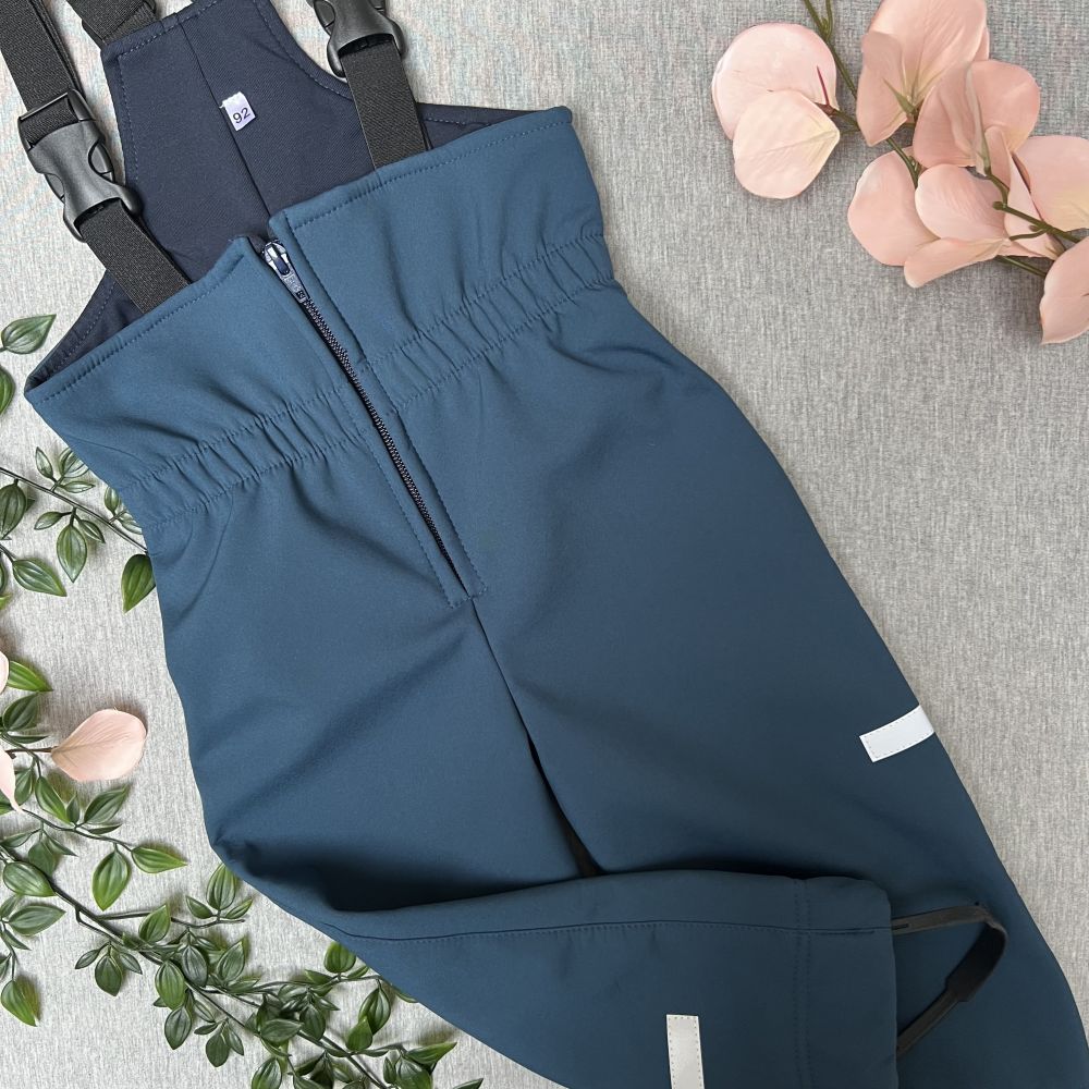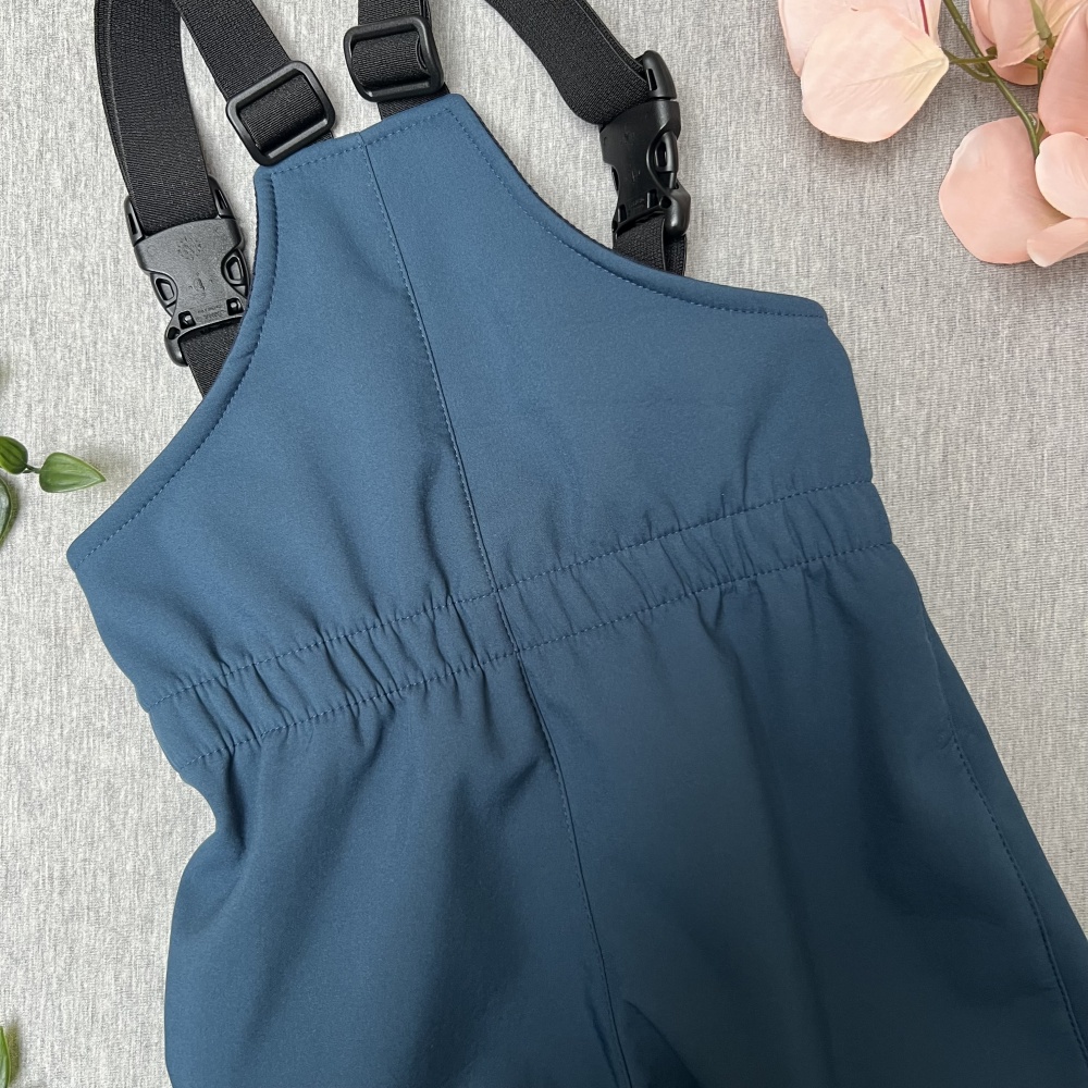 Pants have raised waist, so the kids back will always be warm. Adjustable strap length.