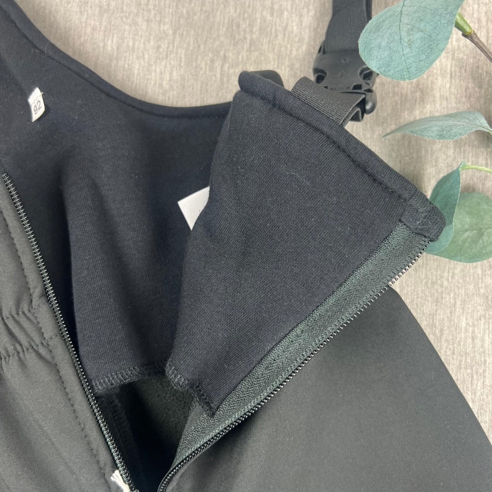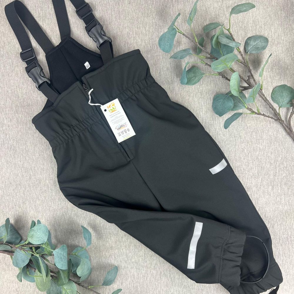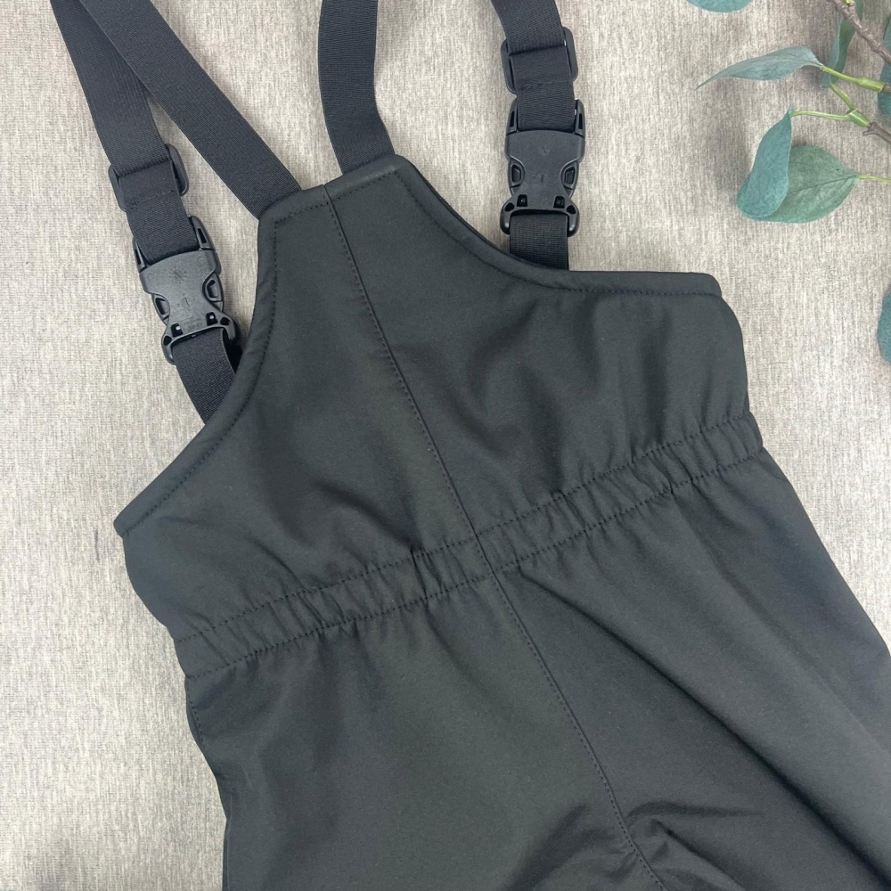 Pants have raised waist, so the kids back will always be warm. Adjustable strap length.