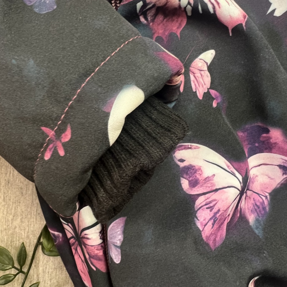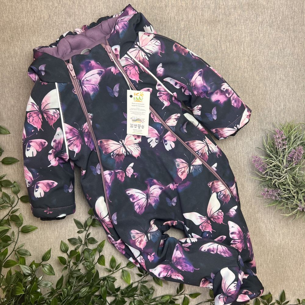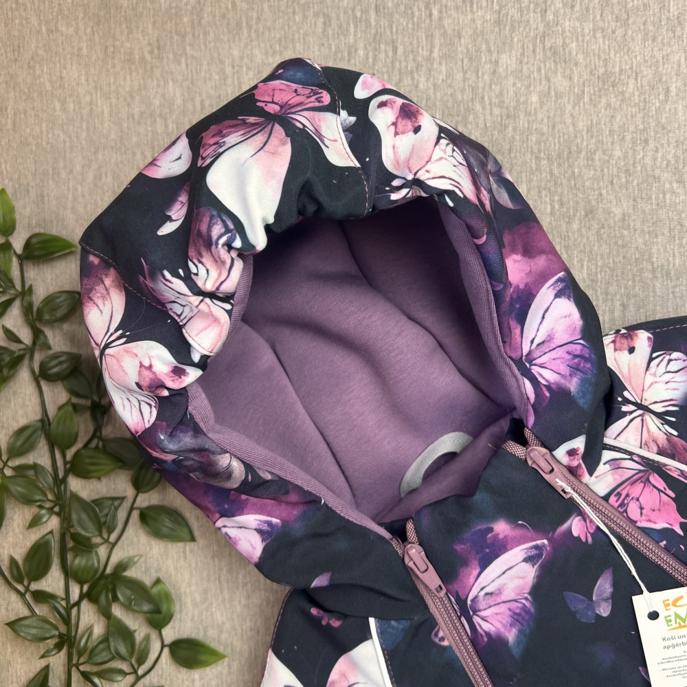 Softshell suit has hood, reflective ribbons on hand seams in the front and back.