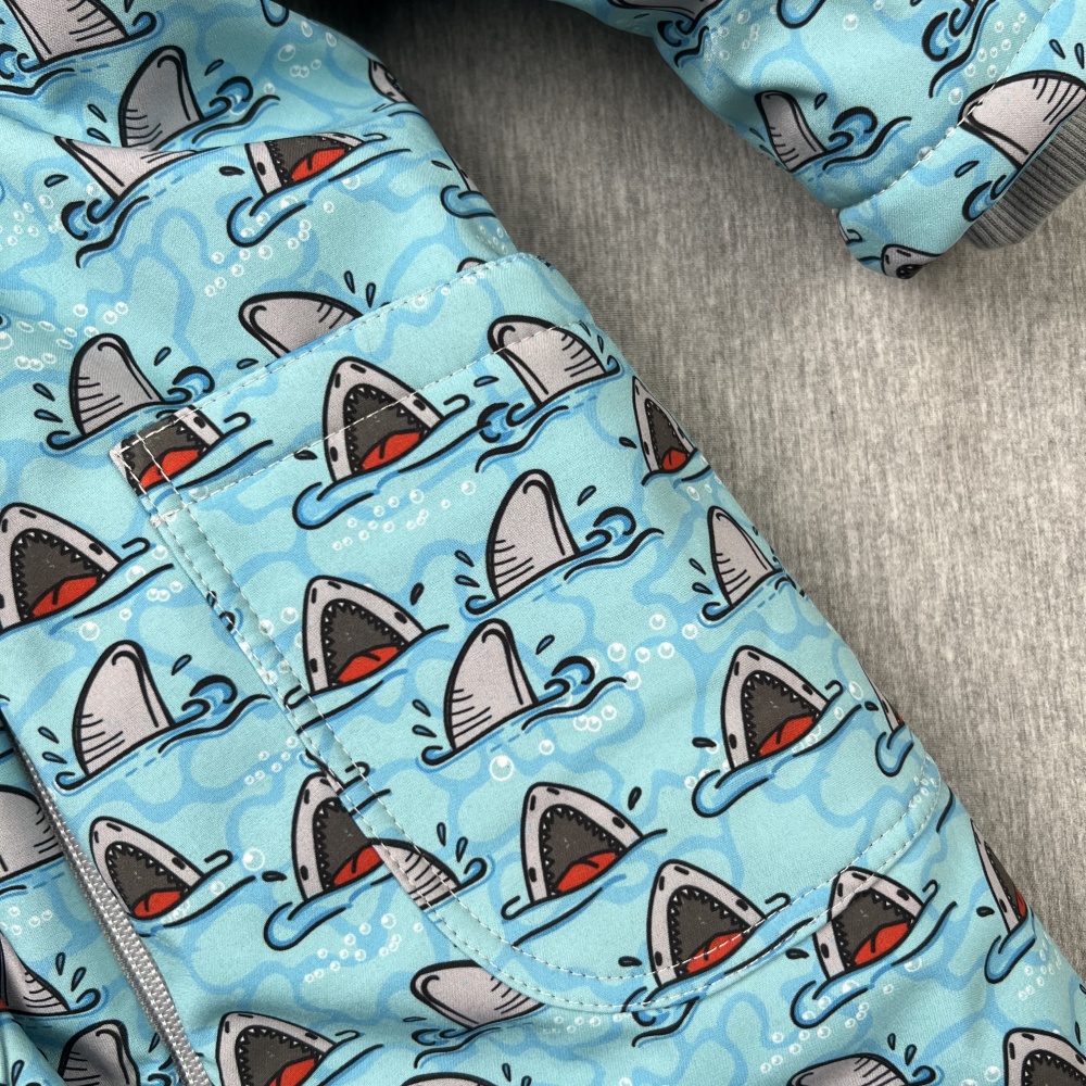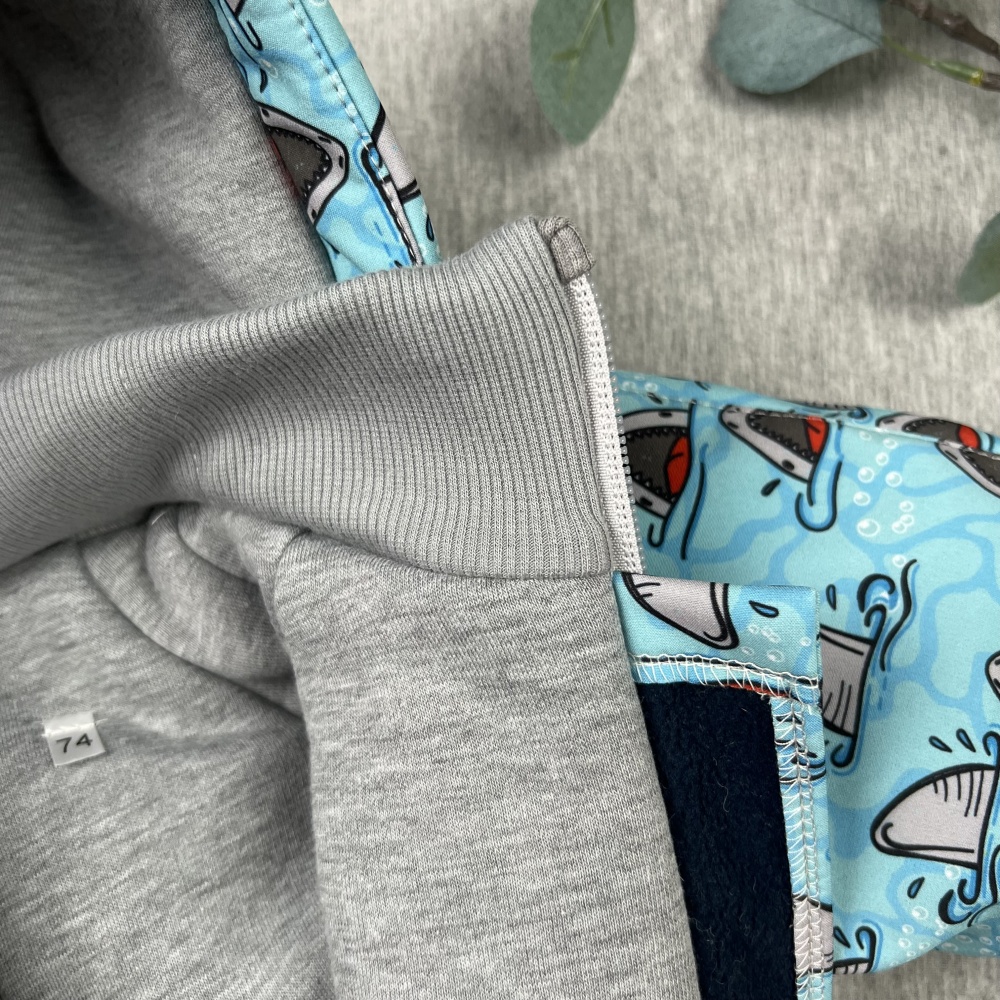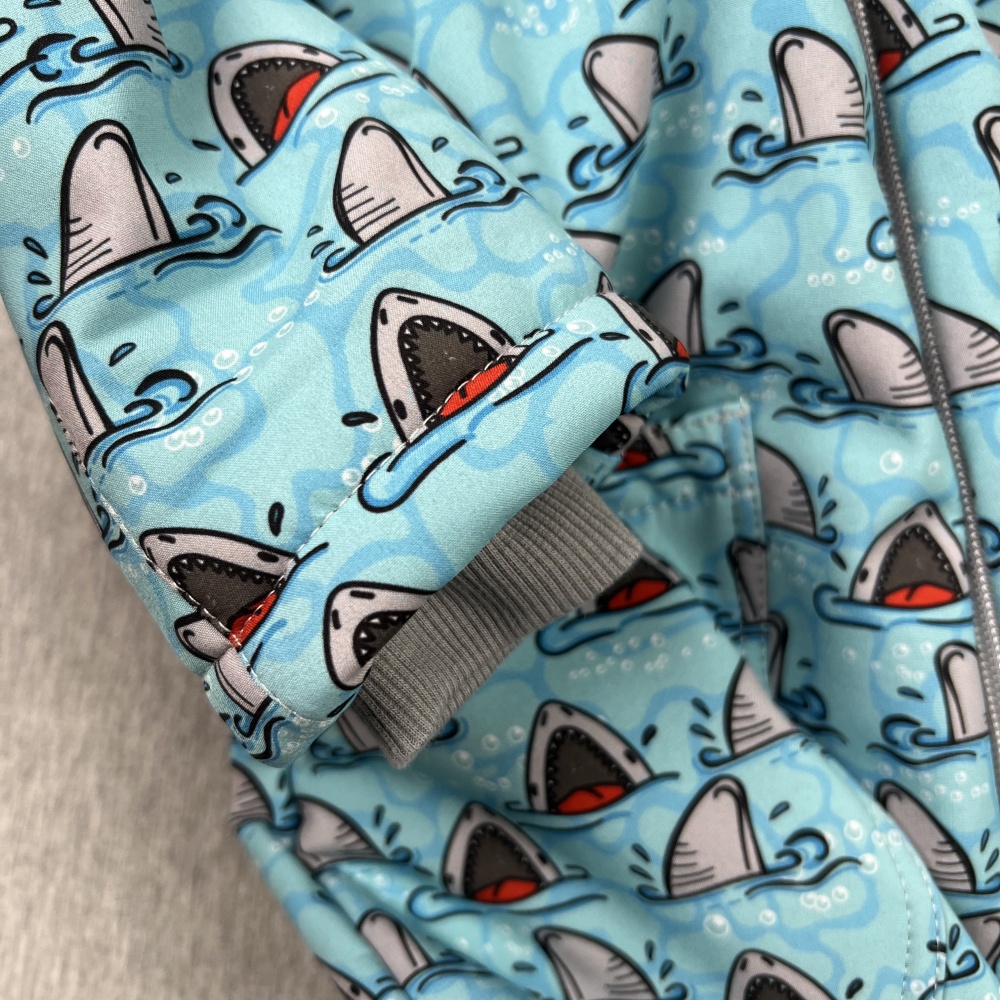 Softshell suit has hood, reflective ribbons on hand seams in the front and back.
