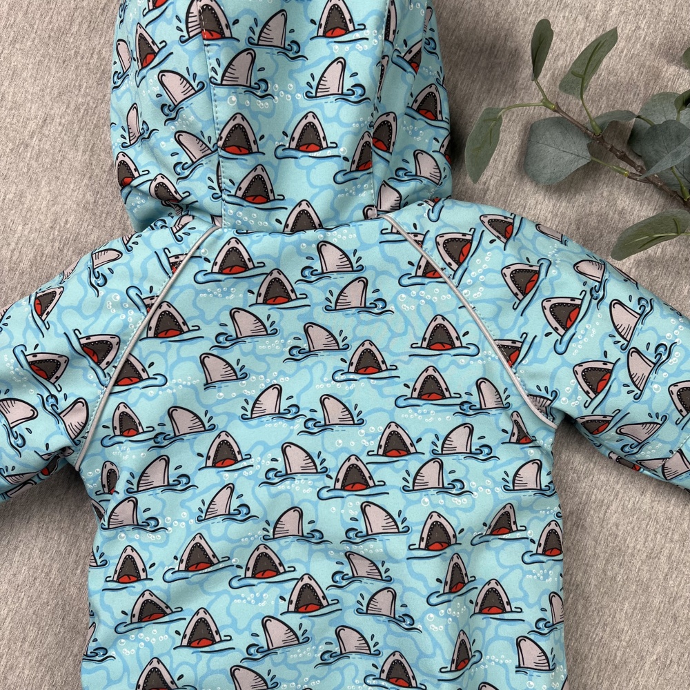 Softshell suit has hood, reflective ribbons on hand seams in the front and back.