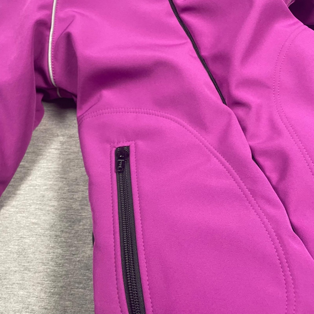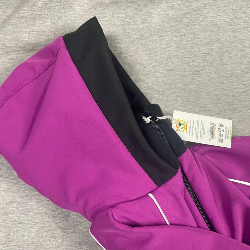 Softshell suit has hood, reflective ribbons on hand seams in the front and back.