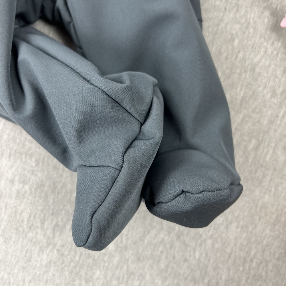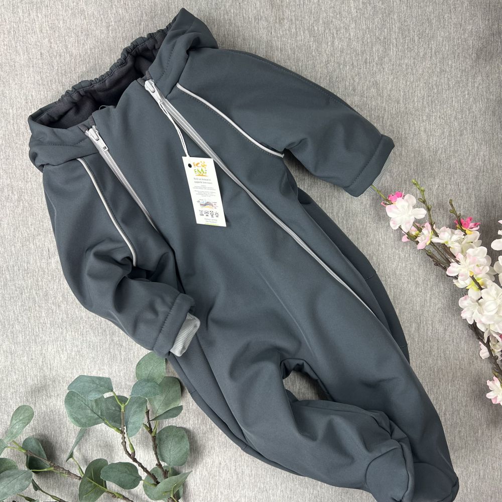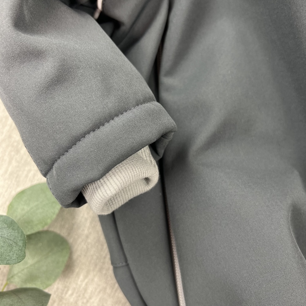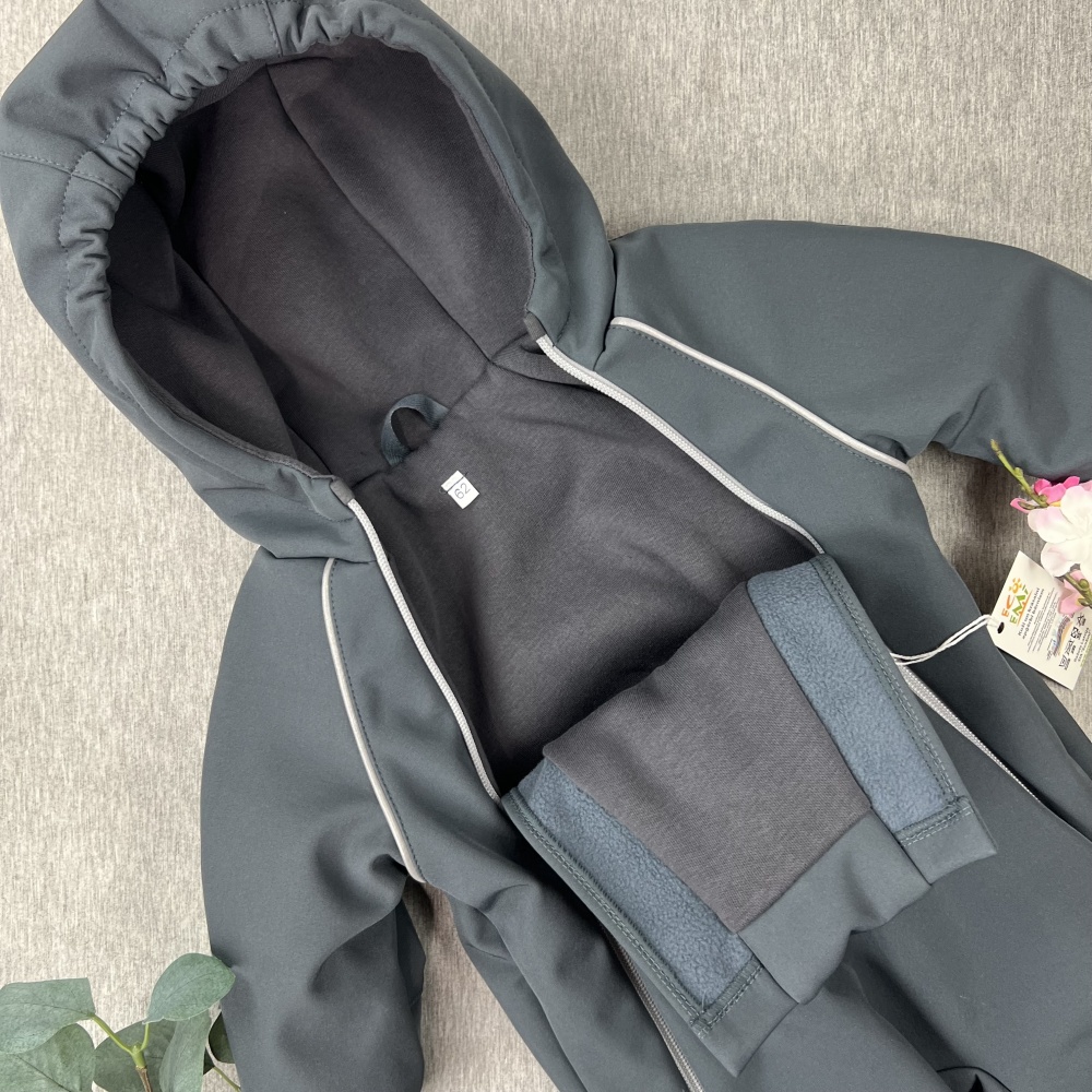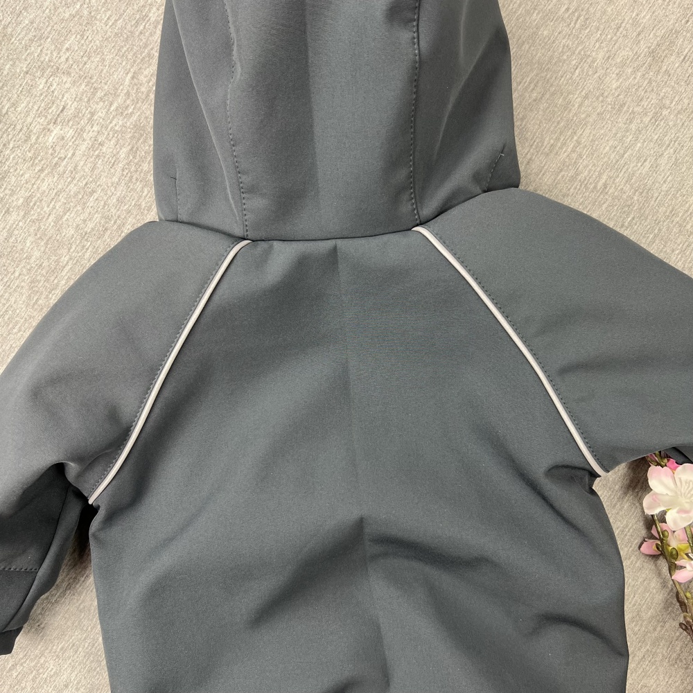 Softshell suit has hood, reflective ribbons on hand seams in the front and back.