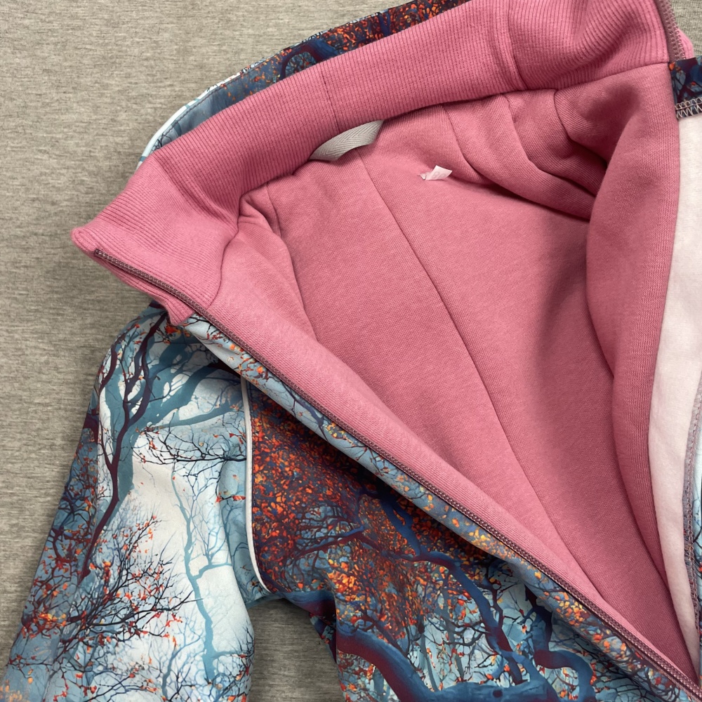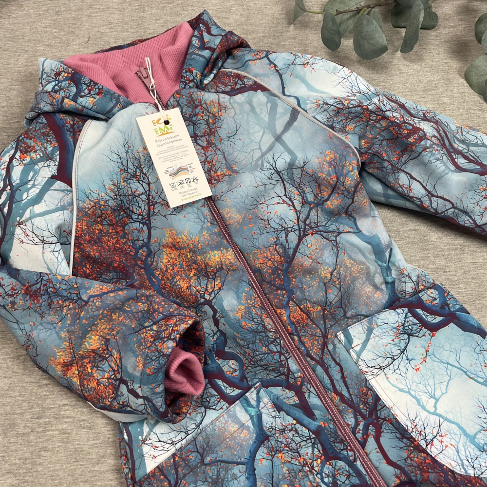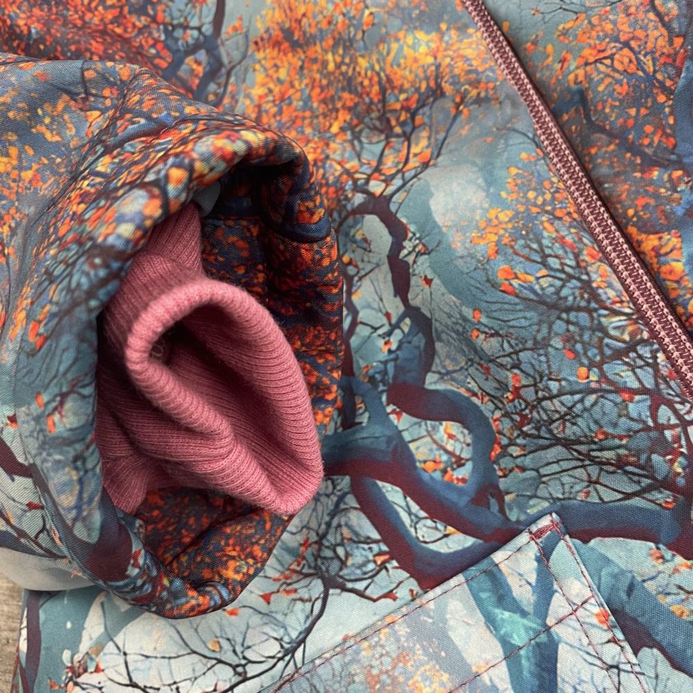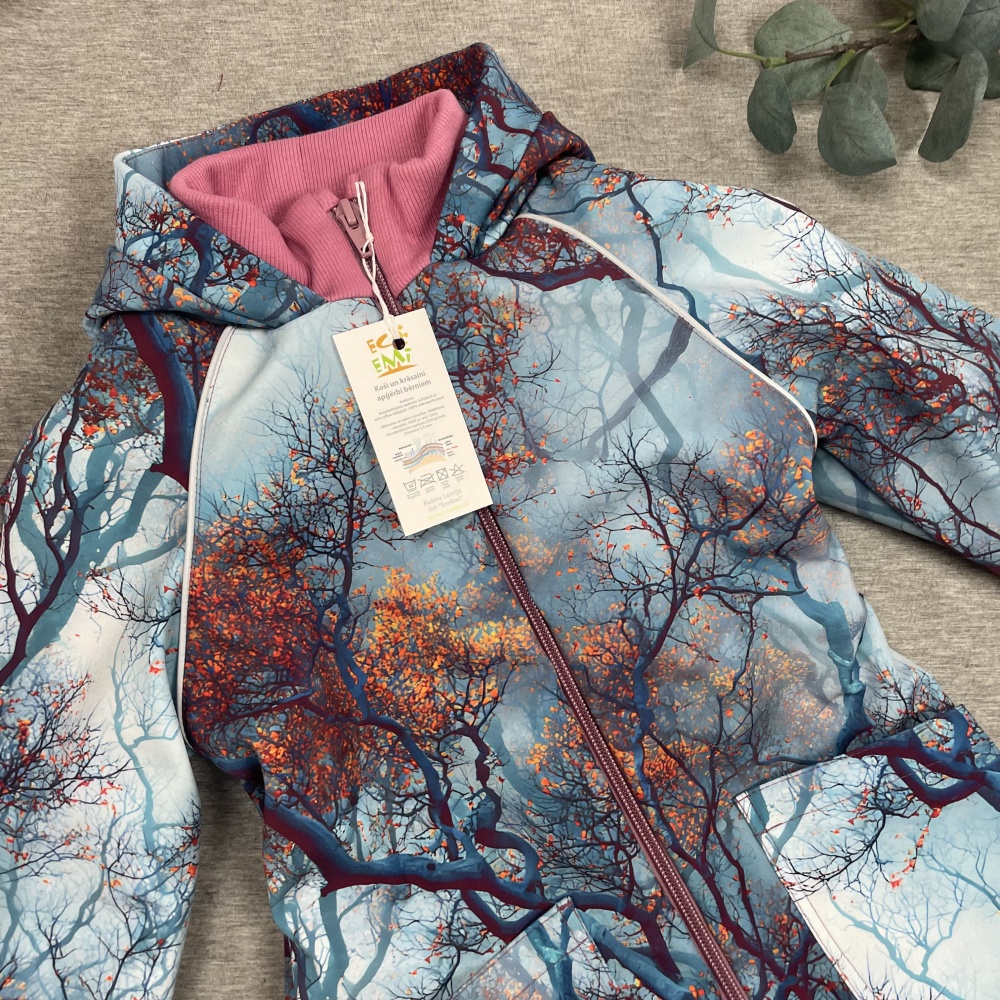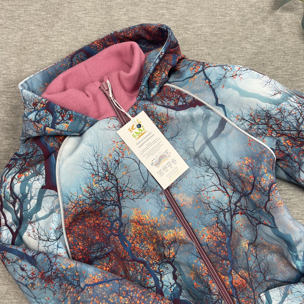 Softshell suit has hood, reflective ribbons on hand seams in the front and back.
