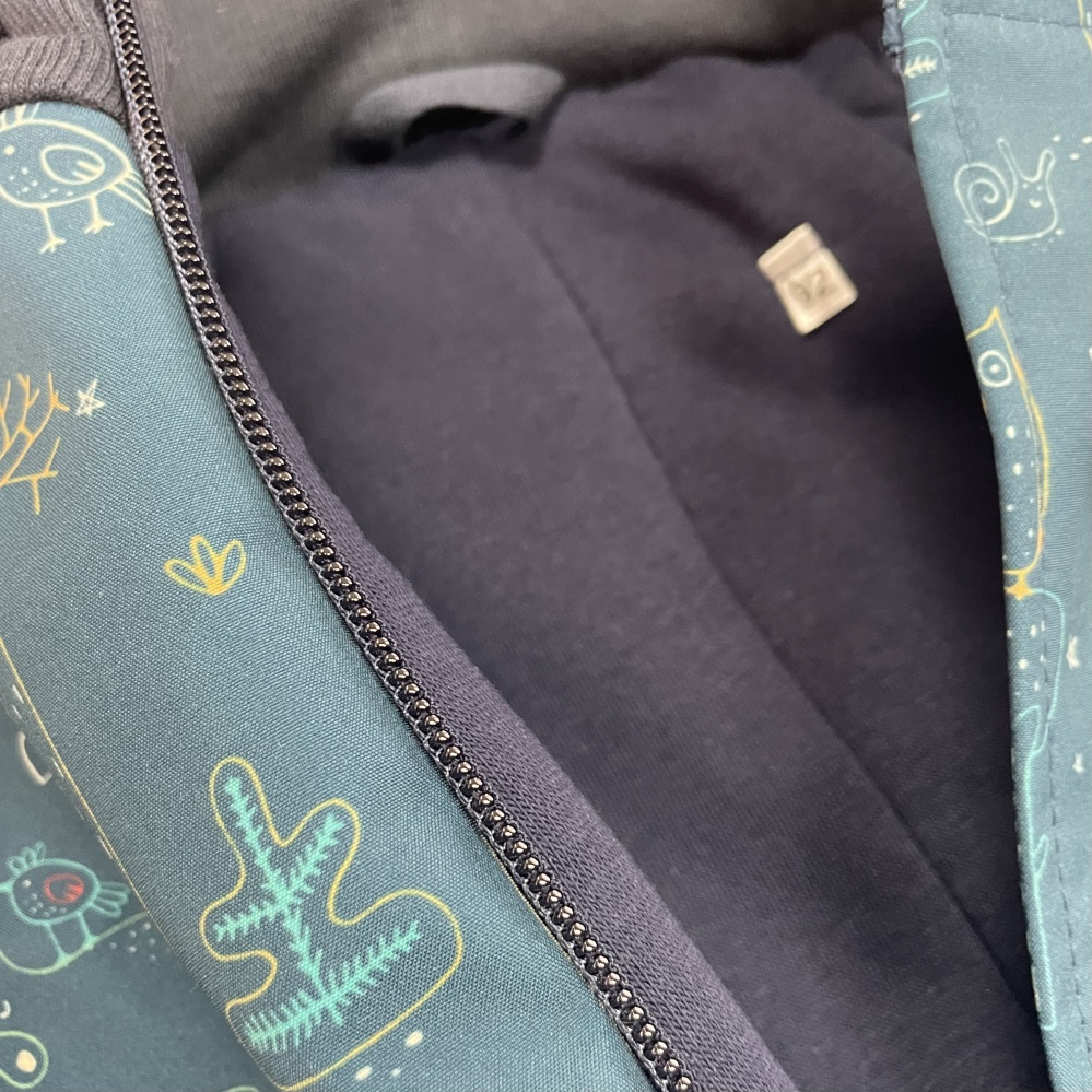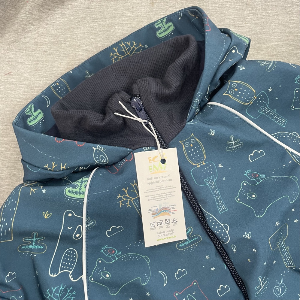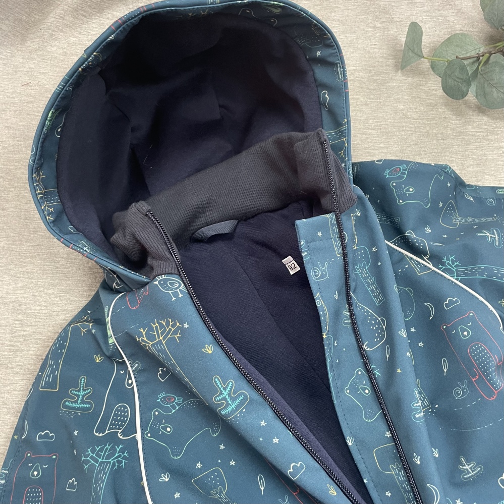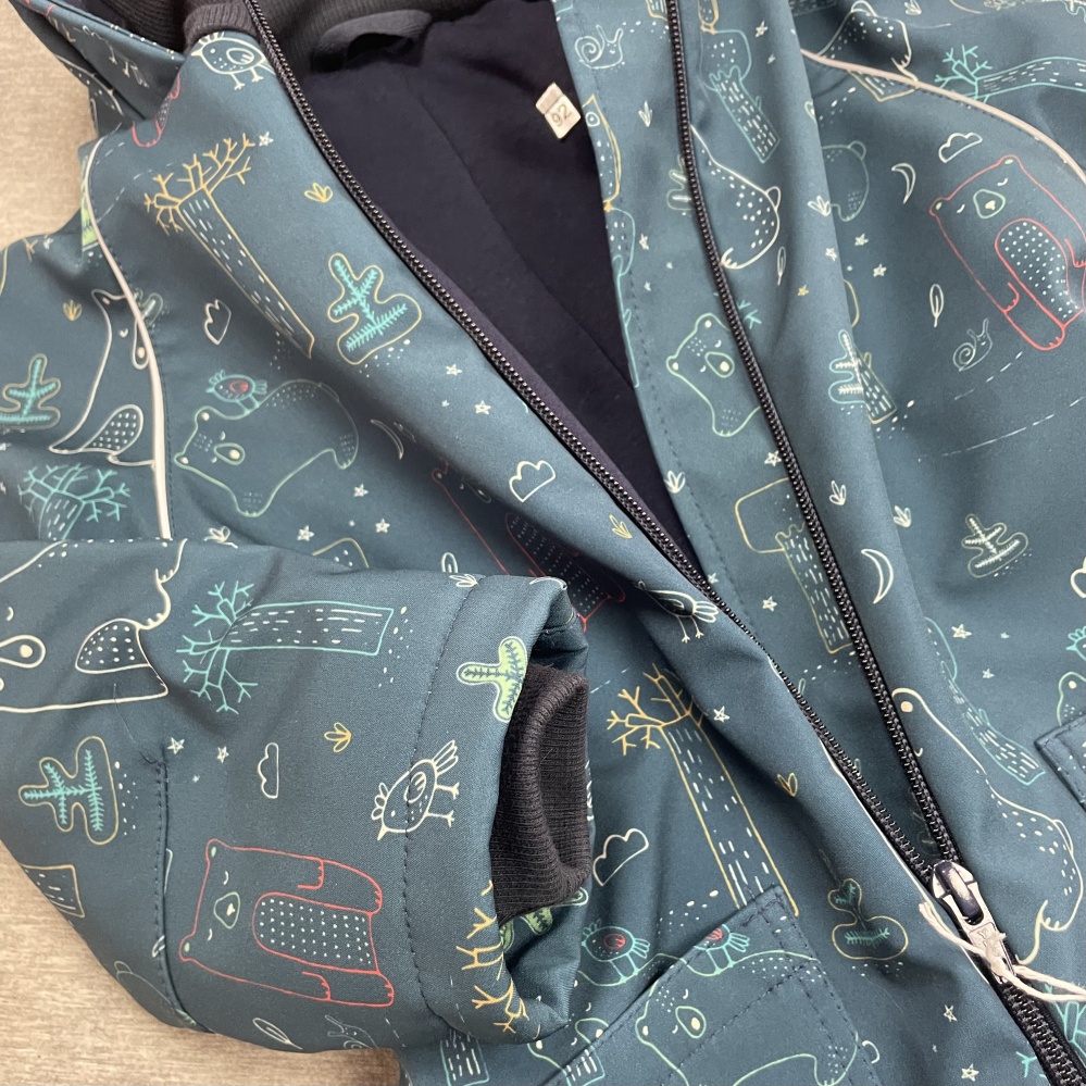 Softshell suit has hood, reflective ribbons on hand seams in the front and back.