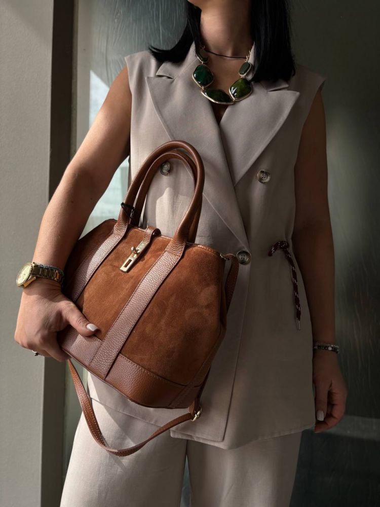 Komplektā ir arī garā plecu siksniņa ar regulējamu garumu.