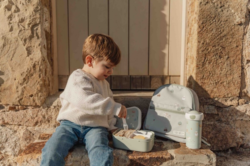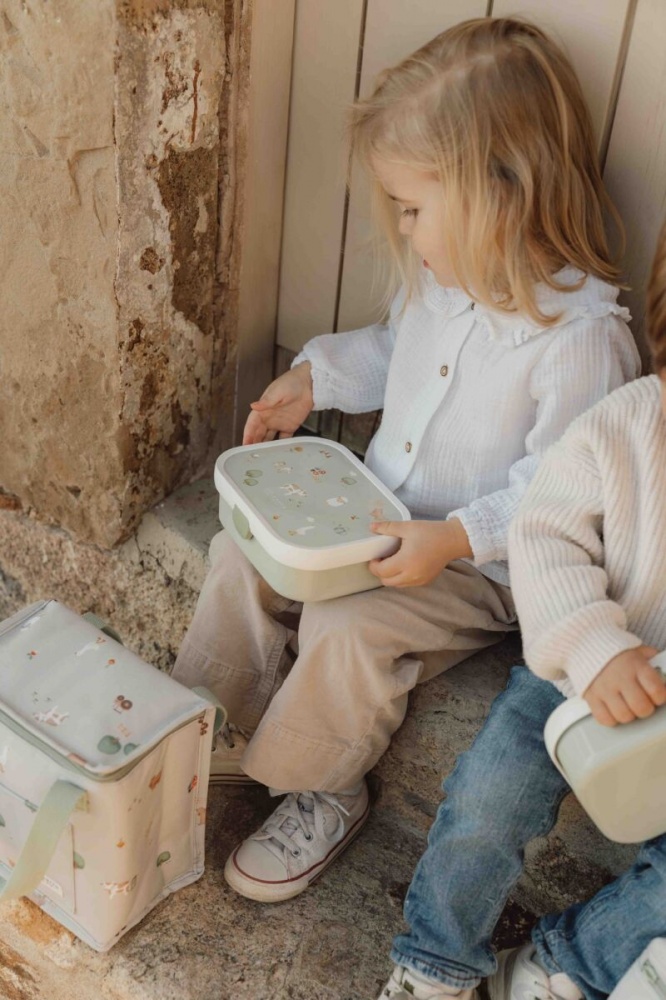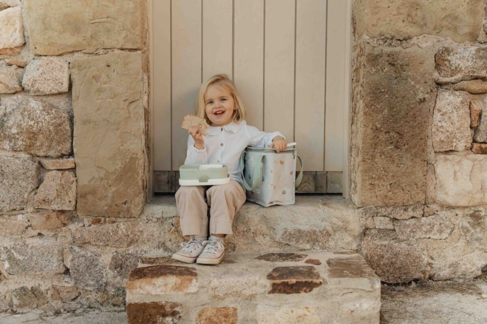 Pusdienu kastīti var sadalīt 3 daļās, lai ērti nodalītu ēdienu vienu no otra. Kastītei klāt ir arī maza dakšinā.
