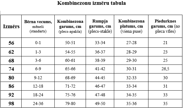 Kokvilnas flīsa un organiskā flīsa kombinezoniem izmēru iesakam izvēlēties atbilstoši bērniņa garuma centimetriem - cik cm garš bērniņš, tādu izmēru izvēlēties, jo visi apģērbi ir jau ar rezervīti. T.i., piemēram, ja bērniņa garums ir 59 cm, tad iesakam izvēlēties izmēru 62.