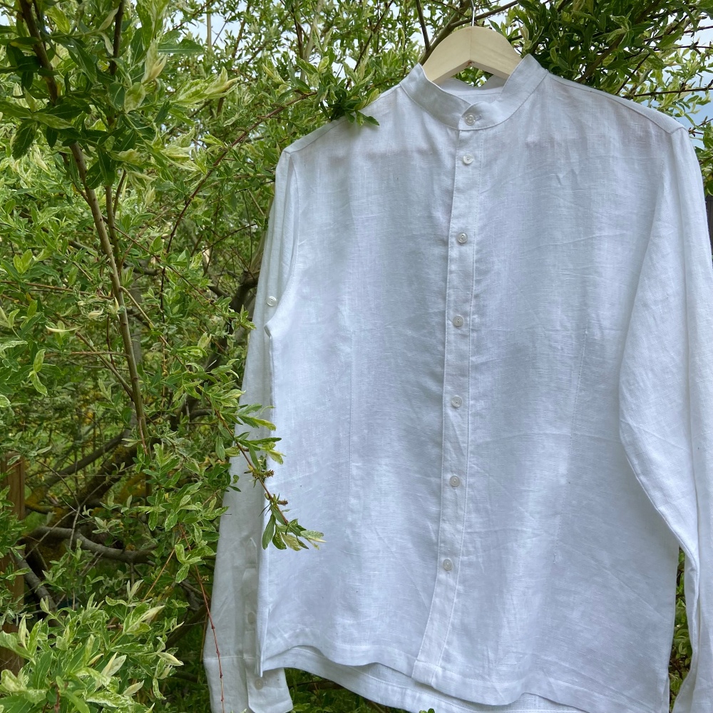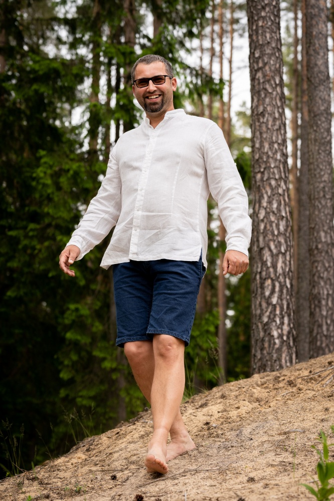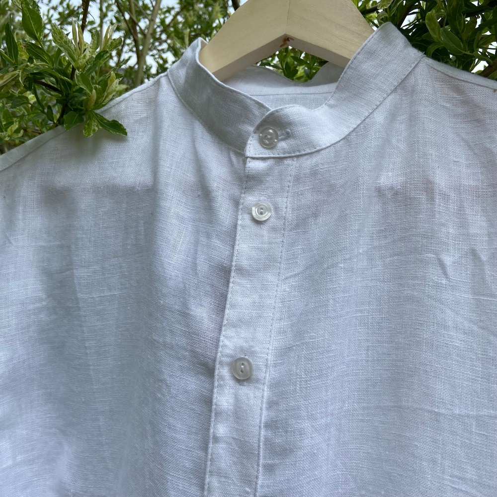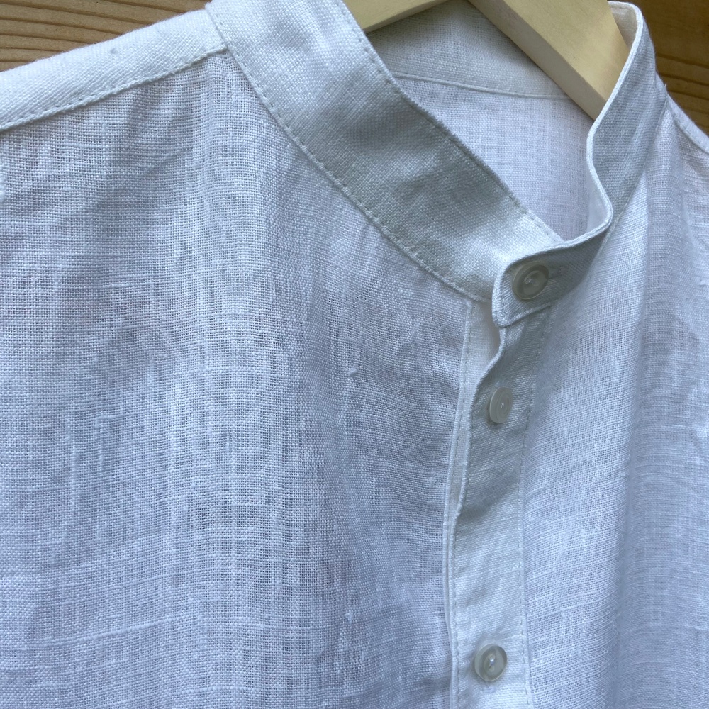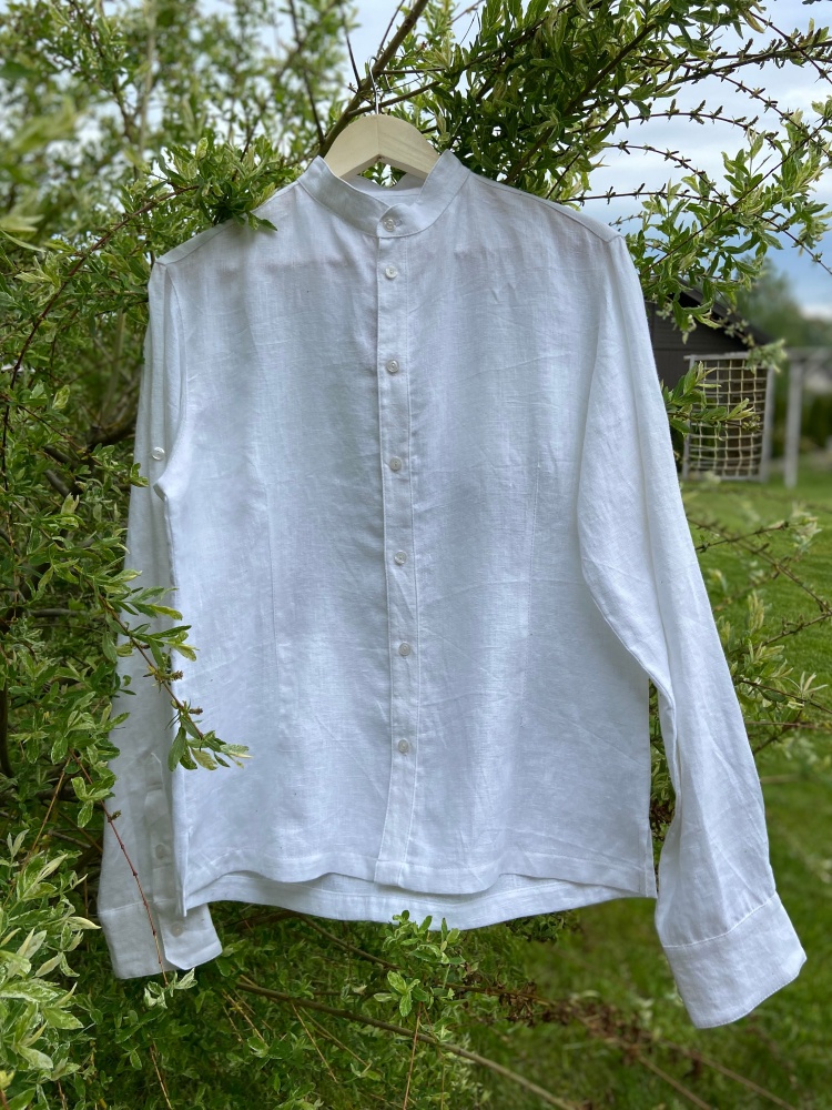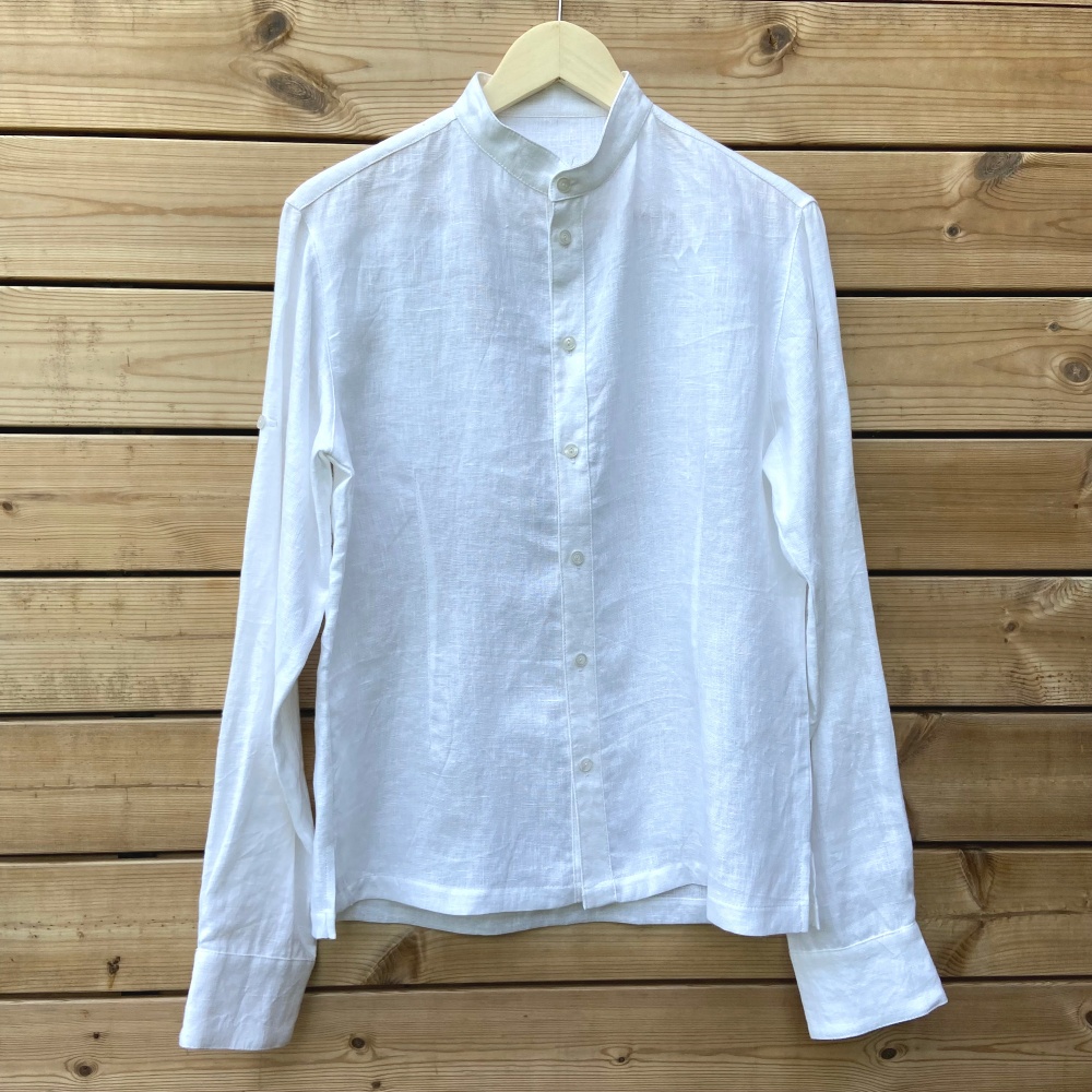 Vīriešu linu krekls ar stāvkrādziņu un ar garām piedurknēm. Kreklam regulējams piedurknes garums - iespējams atlocīt piedurkni, izveidojot atlokus un piepogāt ar pogu.