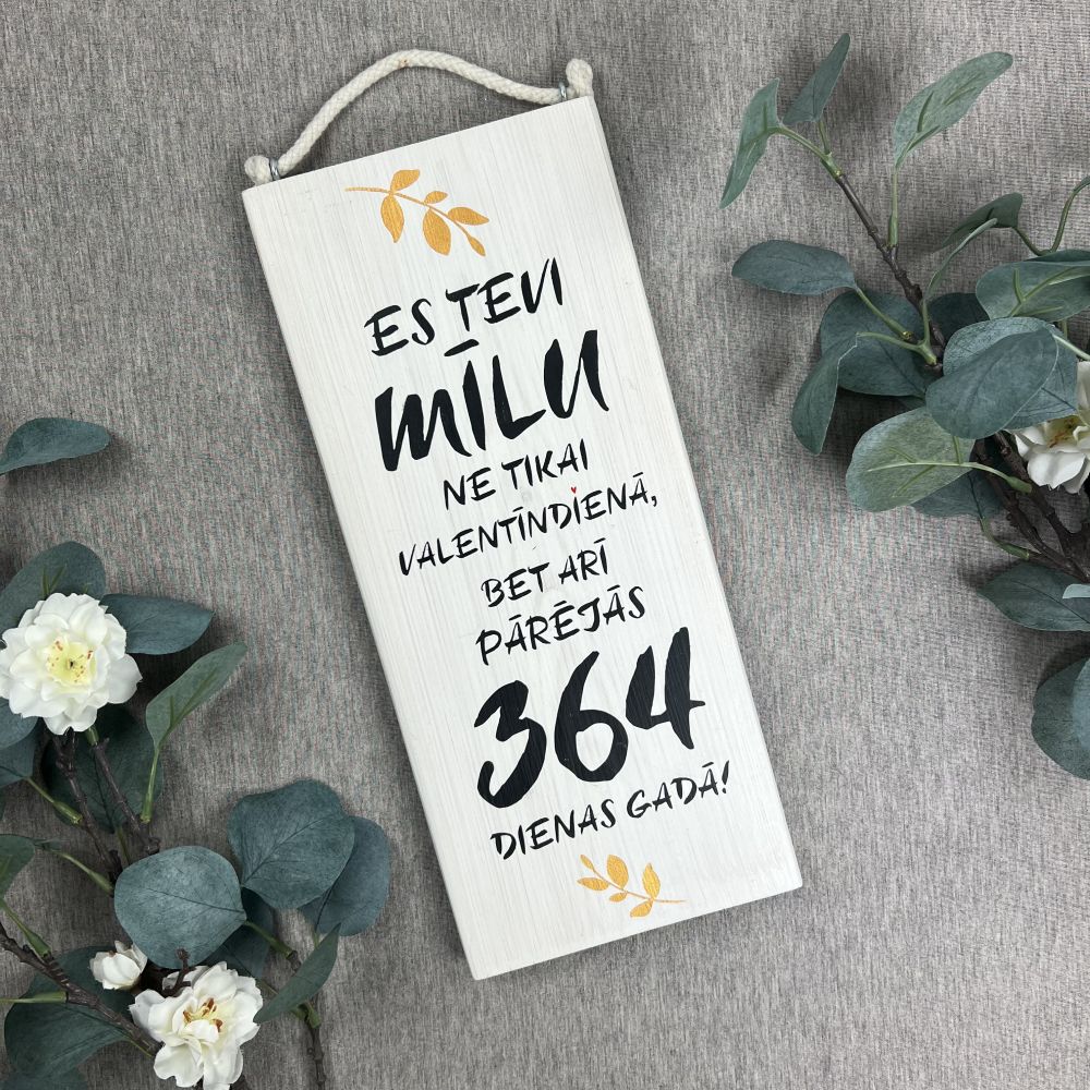 Koka dekors ar mīļu uzrakstu un dizainu - "Es Tevi mīlu ne tikai Valentīndienā, bet arī pārējās 364 dienas gadā"