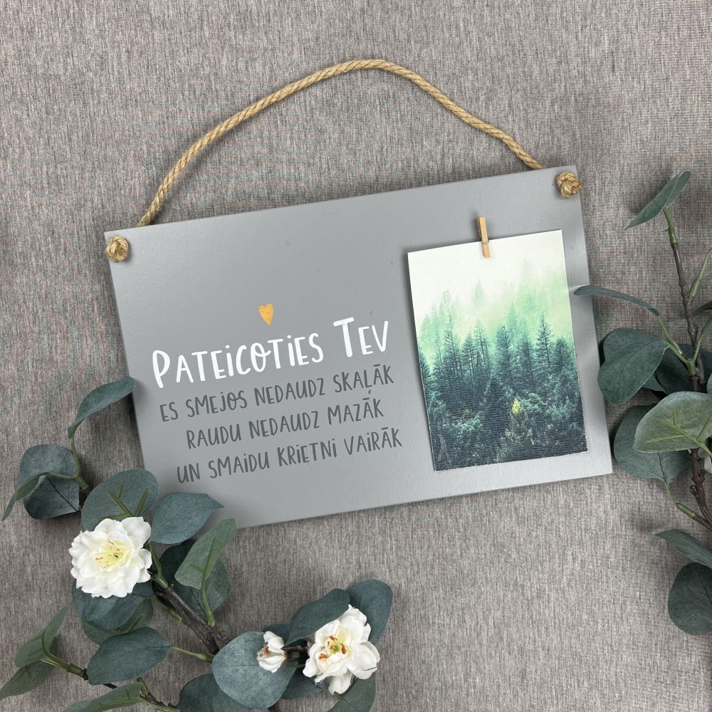 Koka dekors ar mīļu uzrakstu un dizainu - "Pateicoties Tev es smejos nedaudz skaļāk, raudu nedaudz mazāk un smaidu krietni vairāk" Vieta FOTOGRĀFIJAI, kuru vari pielikt ar knaģīti!