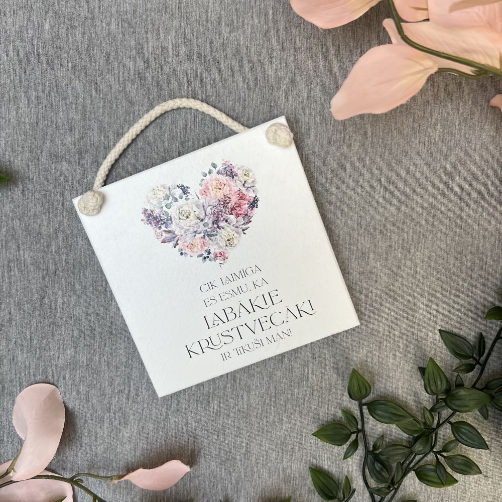 Koka dekors ar mīļu uzrakstu un dizainu - "CIK LAIMĪGA ES ESMU, KA LABĀKIE KRUSTVECĀKI IR TIKUŠI MAN!"