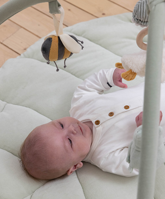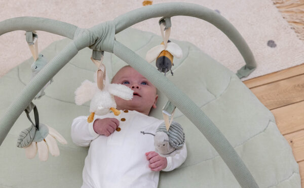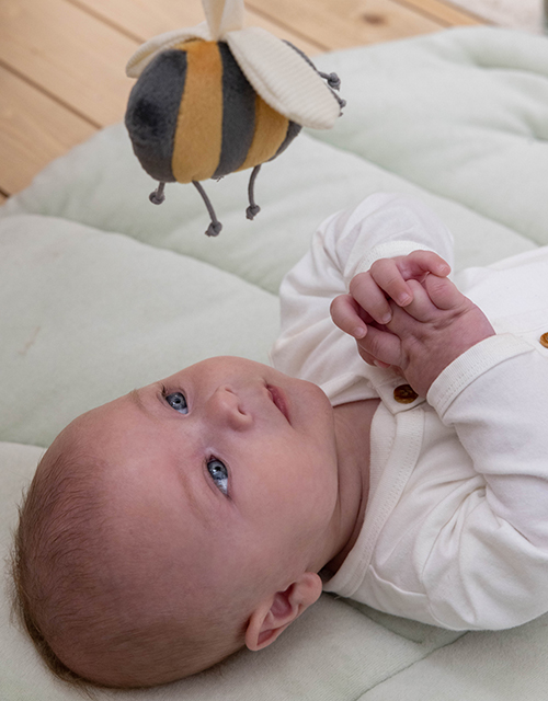 Uz arkas esošie krāsainie pasteļtoņu dzīvnieciņi un figūriņas piesaists mazuļa uzmanību. Mazulis cenšas tiem pieskarties un tos izpētīt.