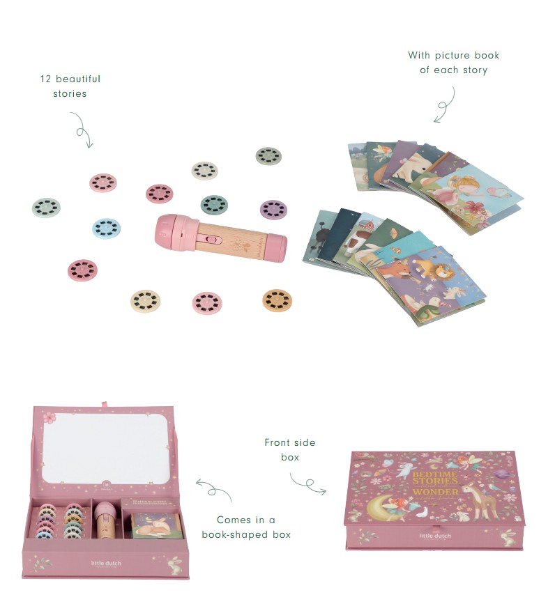 Šis īpašais lukturītis satur 12 diskus, katram no kuriem ir savs stāsts, kas atdzīvojas, pateicoties skaistām un unikālām ilustrācijām, kuras var projicēt uz sienas. Katru stāstu papildina atbilstoša brošūra ar ilustrācijām.