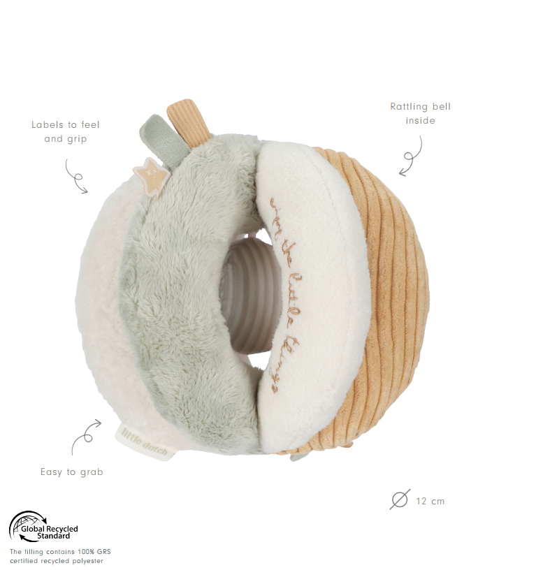 Mazas rociņas, lieli piedzīvojumi! Sniedziet roku un dodieties ceļā! Šī skaisti veidotā Little Dutch satveramā bumba ir lielisks izaicinājums jūsu mazulim. Bumbai ir dažādas tekstūras un raksti, ko izpētīt un satvert. Mazām rociņām to ir viegli satvert, un, kad tā kustas, zvaniņa šķindoņa iepriecinās jūsu mazuli. Rakstainajai mīkstajai bumbai no "Newborn Naturals" kolekcijas ir viegli satverami mezgliņi un dažādas etiķetes, kas attīsta maņas, satver un uztur jūsu mazuli aktīvu uz rotaļu paklājiņa. Tā atbalsta motoriku attīstību un piedāvā nebeidzamu rotaļu prieku. Dažādās tekstūras aicina viņus pieskarties un satvert - ideāli piemērota mazajiem pirkstiņiem. Brīnišķīga pirmā rotaļlieta, ko turēt rokās, izpētīt un vienmēr nēsāt līdzi.