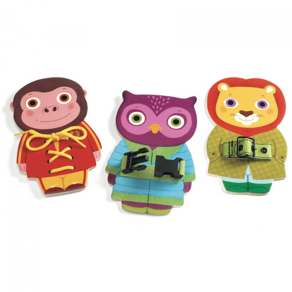 Attīstoša spēle, kas palīdzēs bērniem atsiet un aizsiet dažādas apģērba aizdares - kurpju auklas, jostu un sprādzi. Palīdzi mērkaķītim aizsiet auklas, pūcītei aizspiest sprādzi un lauvēnam aiztaisīt jostu. Attīsta smalko motoriku un loģisko domāšanu, vienlaikus palīdzot apgūt ikdienas prasmes. Dzīvnieka figūriņas izmērs: 18 x 11 cm.
