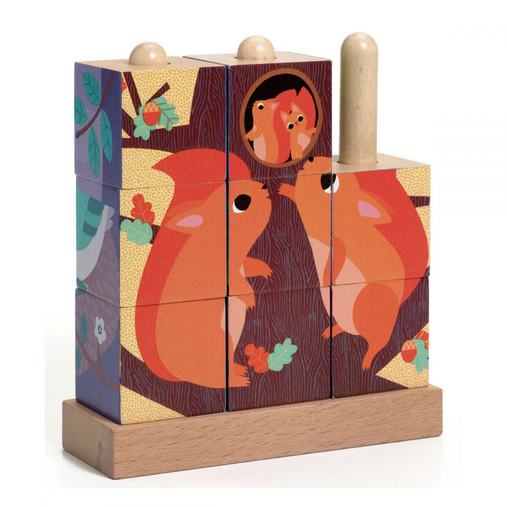 9 koka klucīši tiek savietoti uz vertikāli novietotajiem kociņiem, veidojot vienotu attēlu. Tas atvieglo attēla salikšanu, jo, esot salikti uz kociņiem, tie neizkustās no vietas. Komplektā iekļautas arī 4 kartona kartiņas ar dzīvnieku attēliem, kas palīdzēs bērnam savietot klucīšus pareizā secībā.
