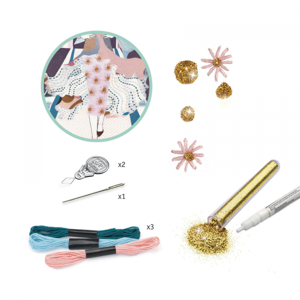 Detalizēts izšūšanas komplekts, kurā iekļauts viss nepieciešamais grezna rokdarba izveidei. Mūsdienīgs ievads izšūšanas mākslā, radot greznu un modernu tērpu, izšūtu uz auduma pamatnes. Komplektā ietilpst auduma pamatne ar izkrāsotām kontūrām, koka rāmis (aplis, 10 cm diametrā) auduma nostiprināšanai izsūšanas laikā, adata, 2 diegu ievērēji, 3 krāsu izšūšanas diegi, spīdumi, līme, kā arī detalizēta pamācība ar profesionālu mākslinieku sniegtajām instrukcijām un padomiem, kā iegūt lielisku rezultātu.