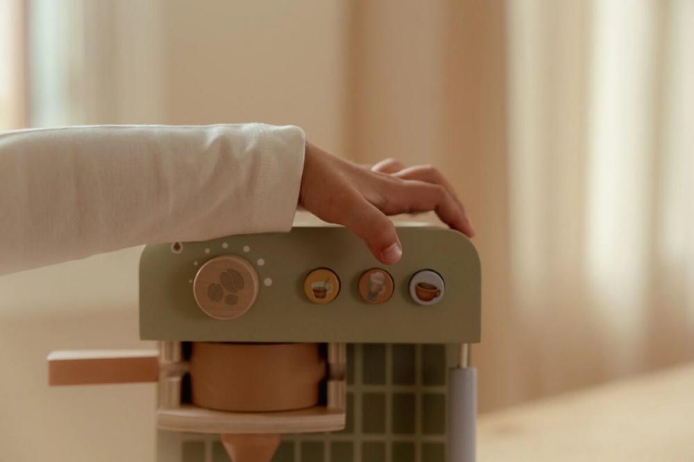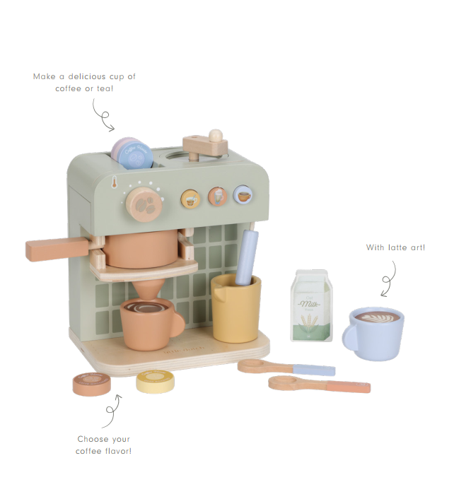 Ir pienācis laiks gardai kafijai vai tējai! Bērniem patīk darīt pieaugušo lietas, piemēram, pagatavot karstu tasi kafijas. Ar šo koka kafijas automātu no Little Dutch mazie baristas var samalt pupiņas, ievietot kafijas kapsulu un apmaisīt dzērienu ar karoti. Komplektā ietilpst divas krūzes, divas karotes, piena krūze, piena pakas un pat kapučīno trafareti īstai kafijas pieredzei. Automātam aizmugurē ir jautras ilustrācijas. Kafijas automāts lieliski iederas Little Dutch virtuvē un ir lielisks papildinājums rotaļu kafijas stūrītim vēl lielākai jautrībai!