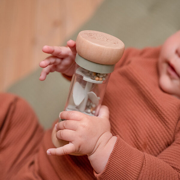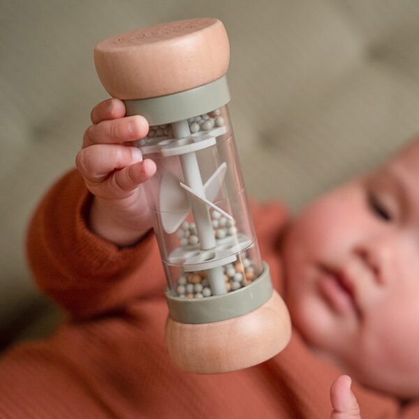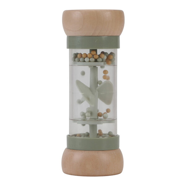 Pagrieziet šo grabuli un klausieties nomierinošo bumbiņu skaņu, kas pārvietojas no vienas grabulīša puses uz otru. Tas stimulē mazuļa maņu attīstību un muzikālo talantu. Bumbiņas izkrīt cauri mazām atverēm caurulē un griež dzenskrūvi, kā rezultātā rodas patīkama skaņa. Lietus grabulītis ir paredzēts mazām rociņām un ir ērti turams.