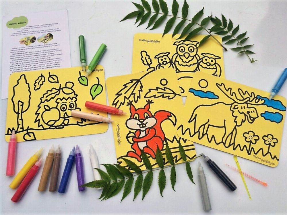 Komplektā ietilpst 4 (izmērs: A5) izkrāsojamas kartītes ar meža iemītnieku attēliem, kā arī 12 toņu krāsainas smiltis, kas sapildītas tūbiņās ērtākai krāsošanai, divi irbulīši un 4 caurspīdīgās plēvītes gatavo aplikāciju iepakošanai.
