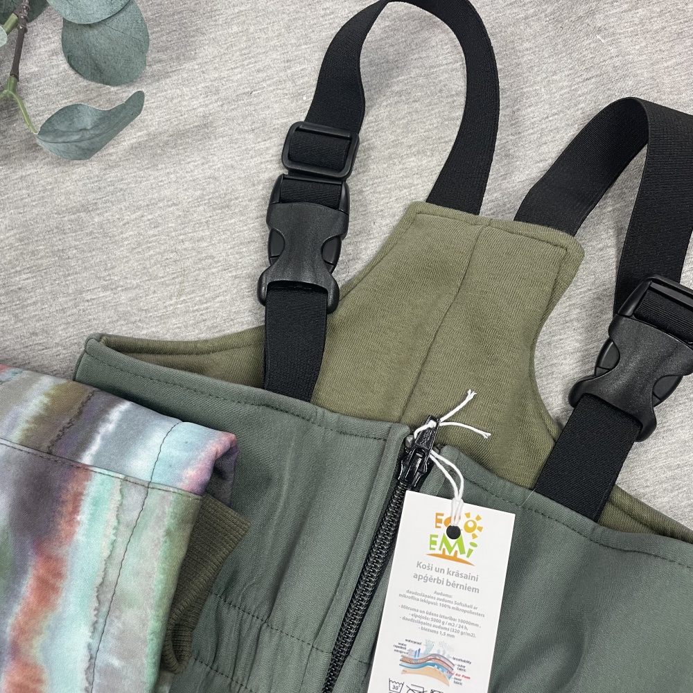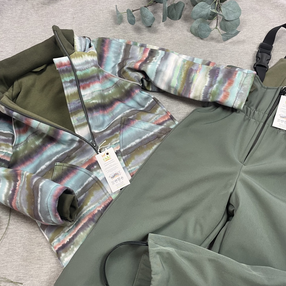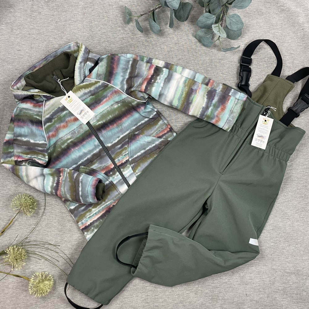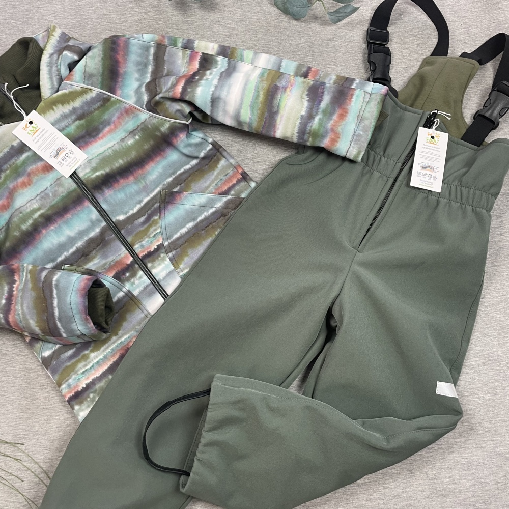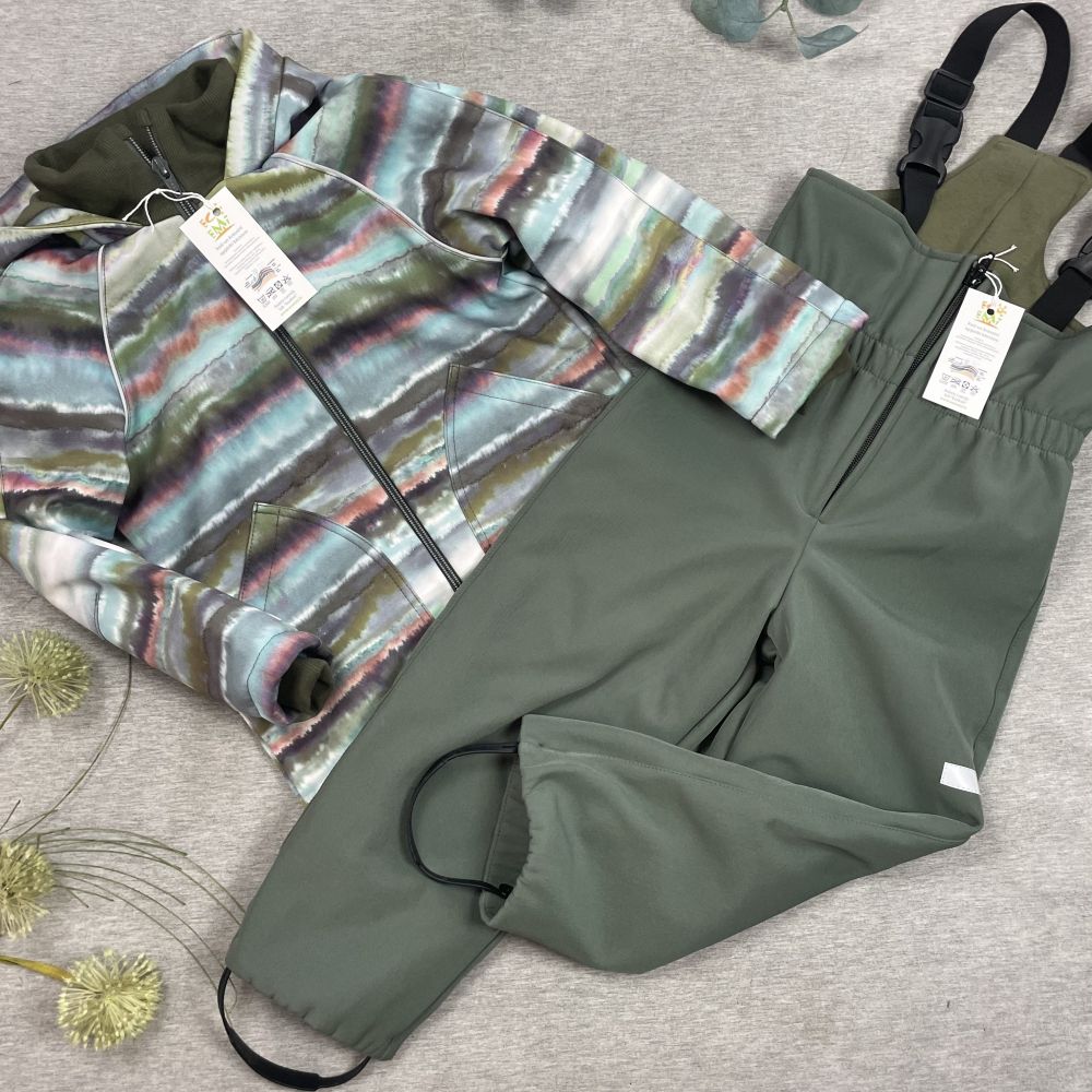Softshell apģērbu komplekts: kombinezonbikses ar lencēm un virsjaka.